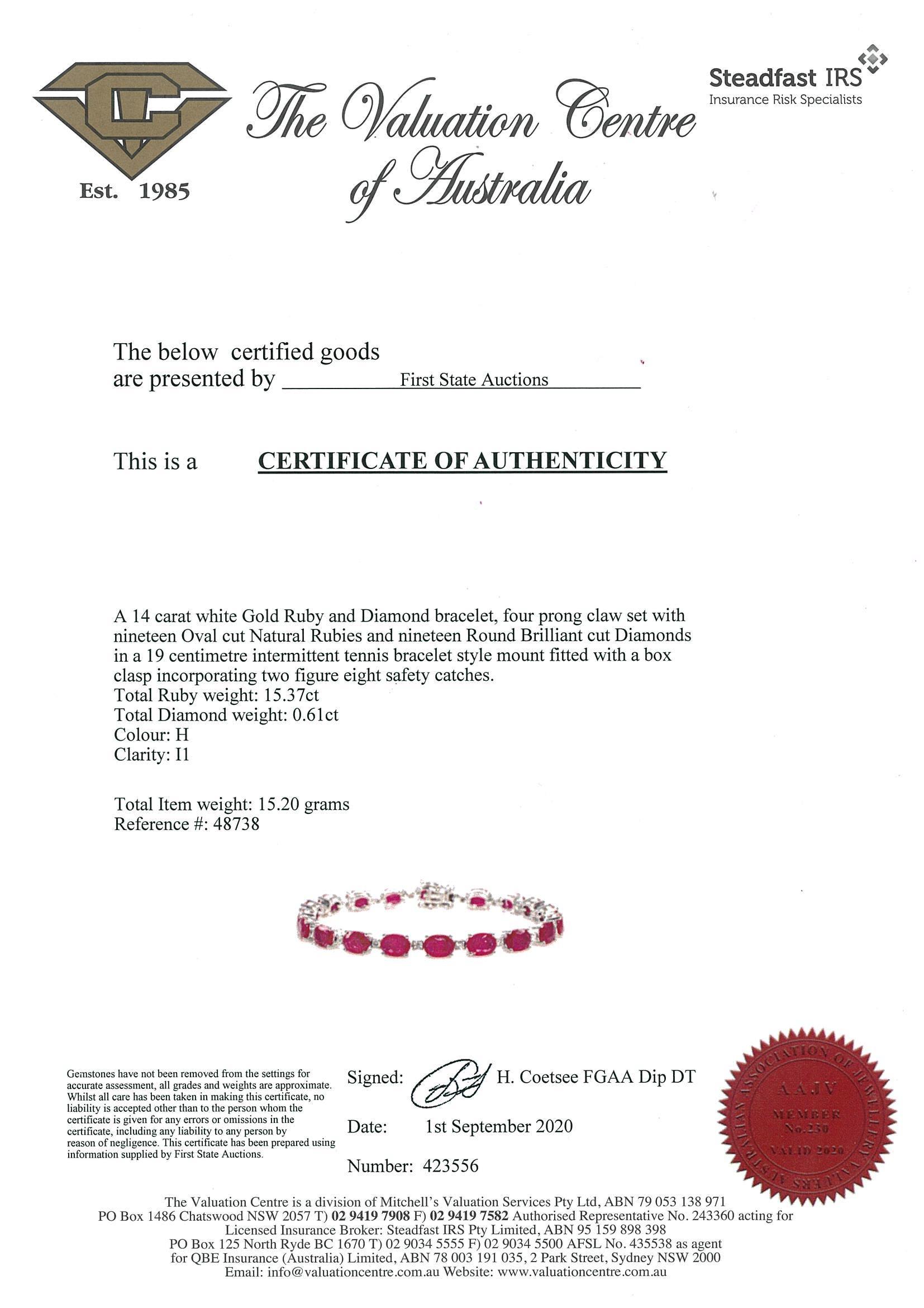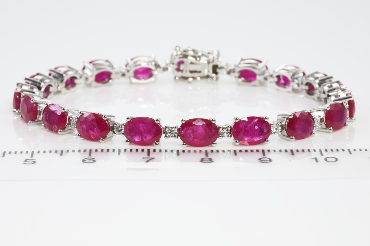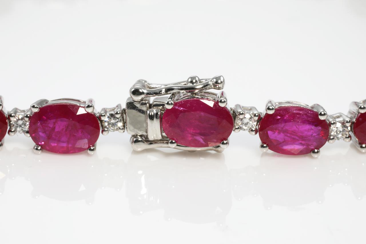 Ruby and Diamond bracelet with oval shape Rubies totalling 15.37cts and Diamonds totalling 0.61cts (Estimated grading: H P1). 14ct white gold. Length: 17cm. Weight: 15.2gm. With Certificate #423556 (As New)