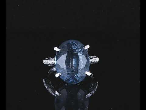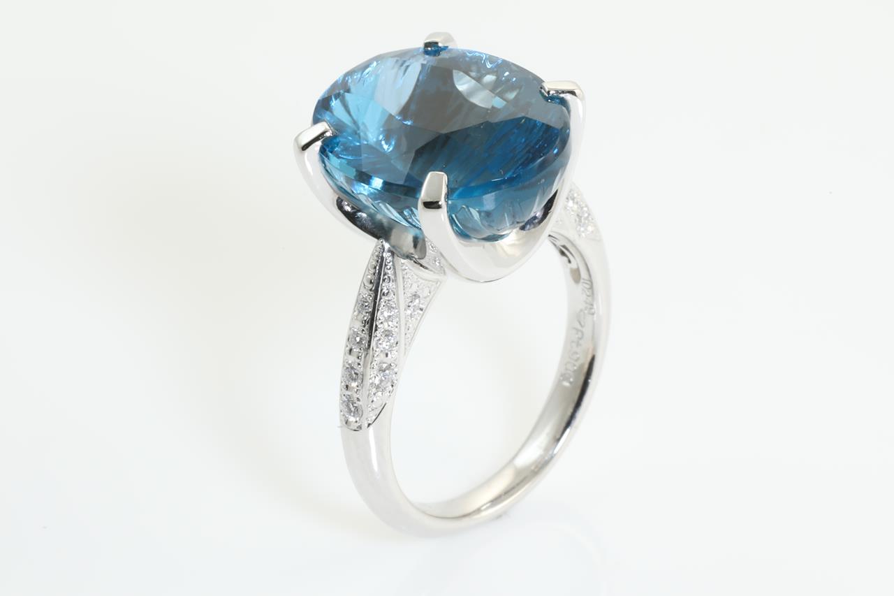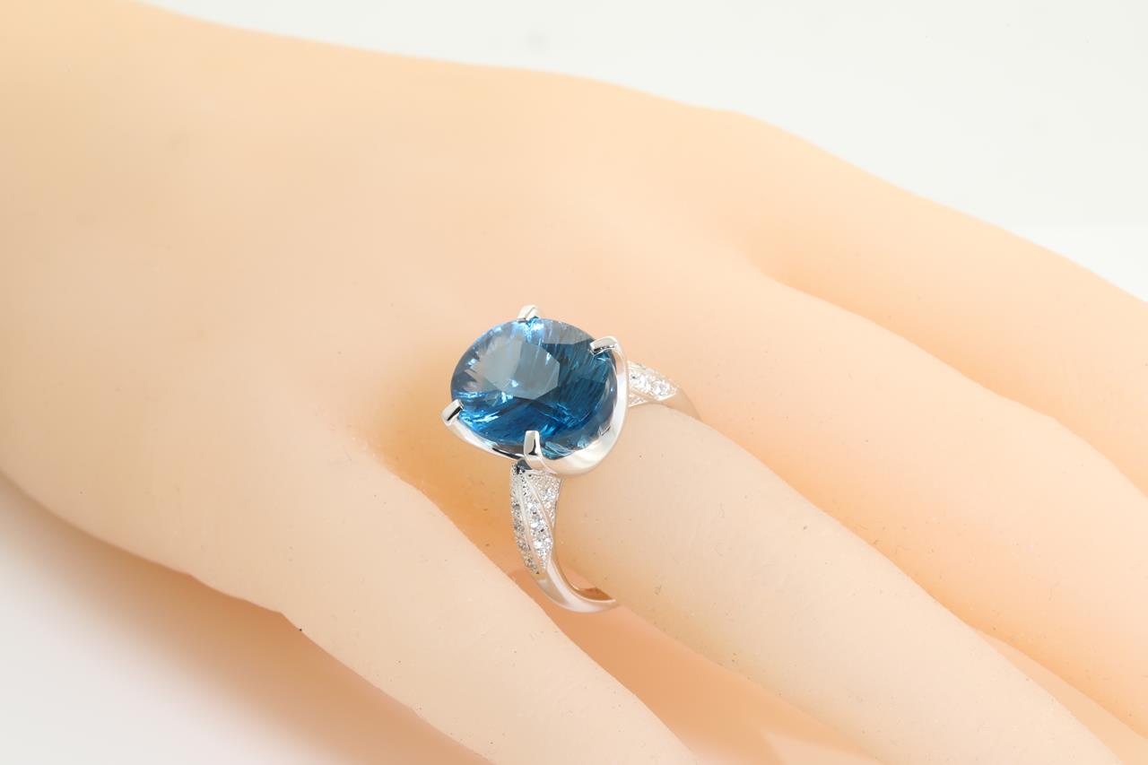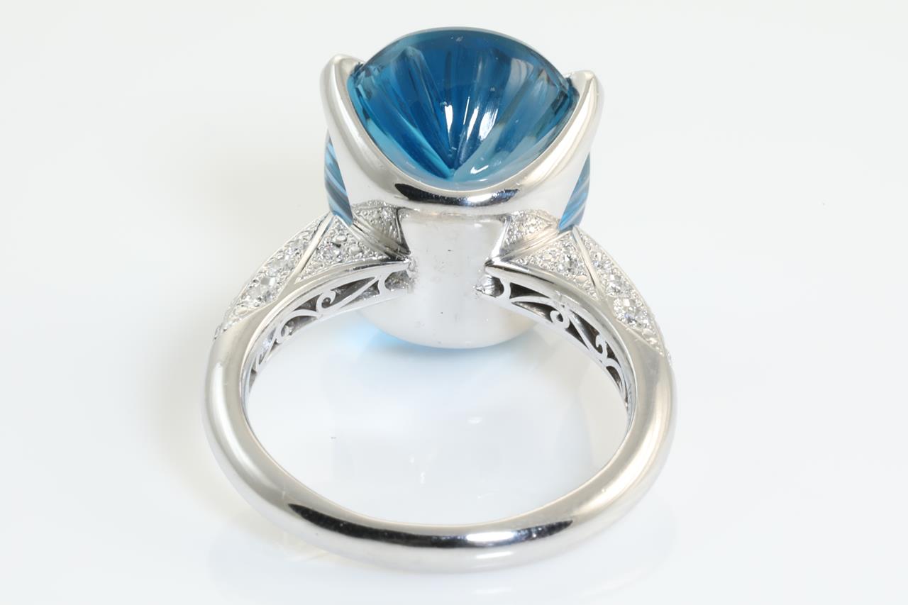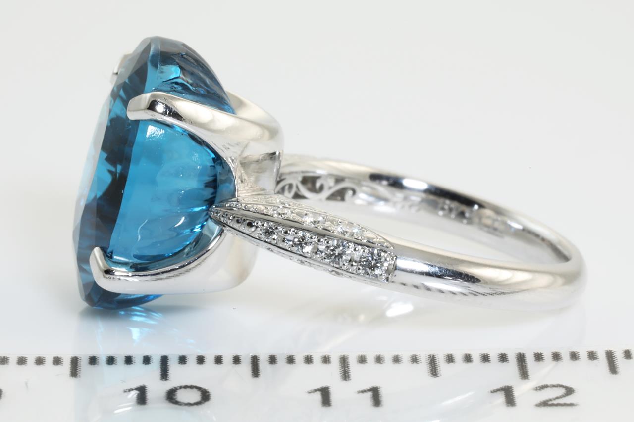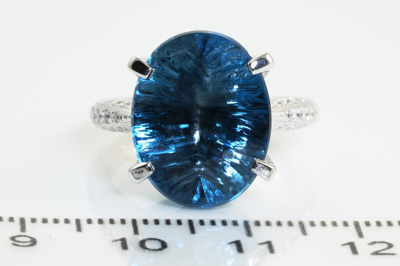 Topaz and Diamond ring with oval London Blue Topaz of 15.49ct and Diamonds totalling 0.22cts. Platinum. Ring size N - Ring resizing is not recommended. Weight: 14.0g (Pre-owned)