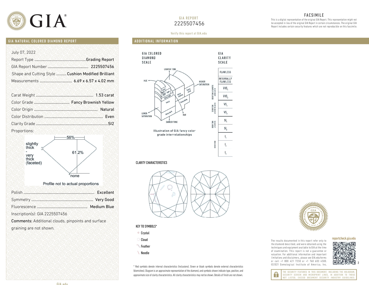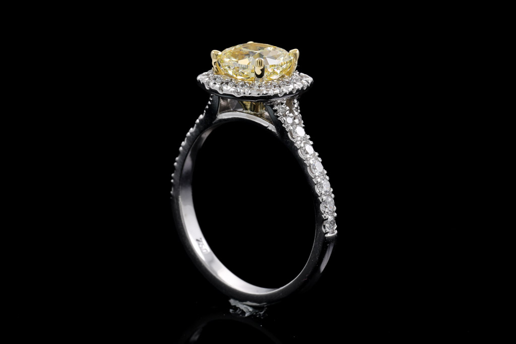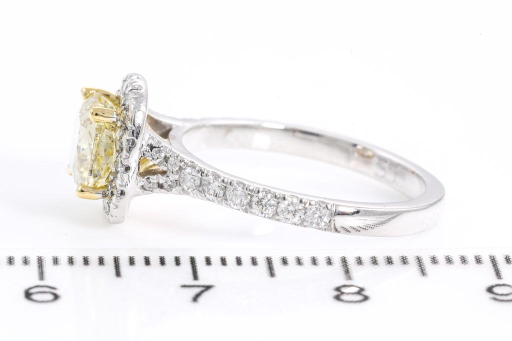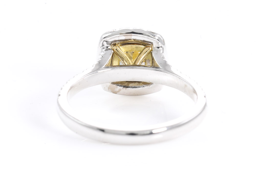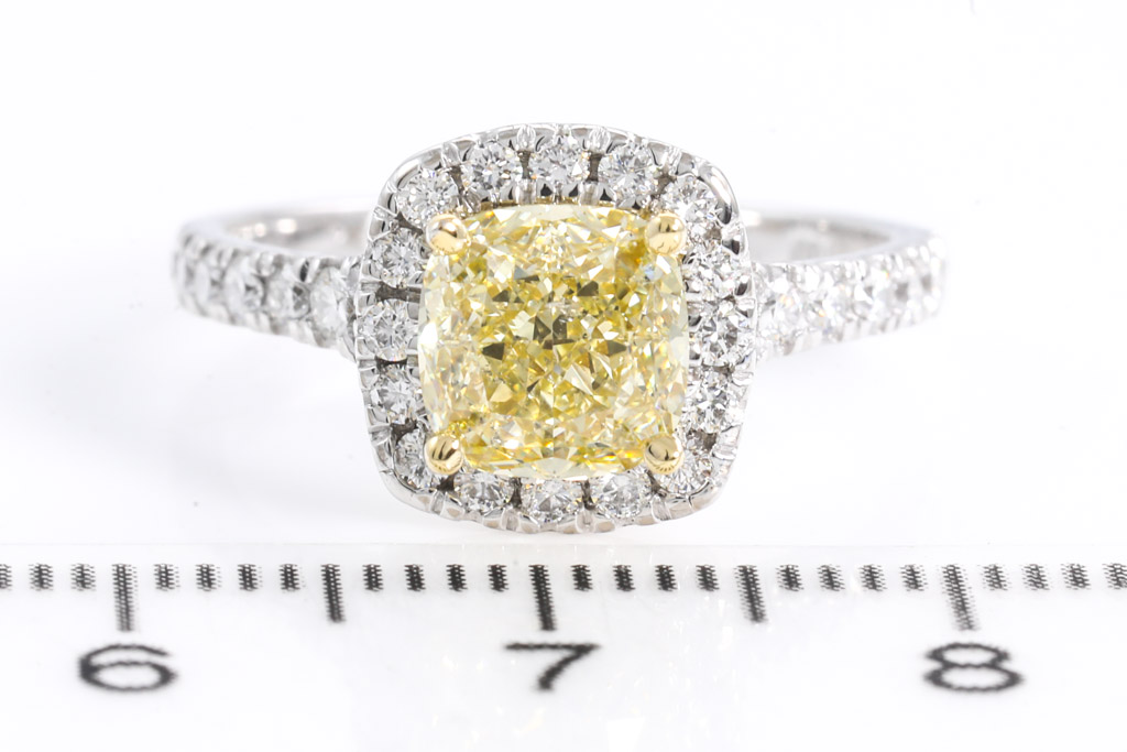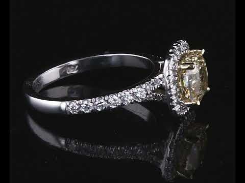 Diamond halo ring with centre cushion cut Diamond of 1.53ct (with GIA report graded as Natural Fancy Brownish Yellow Even SI2 #2225507456) and surrounding Diamonds totalling 0.42cts (Estimated grading: G-H VS-SI). 18ct yellow and white gold. Ring size L1/2. Weight 4.4g. (New)