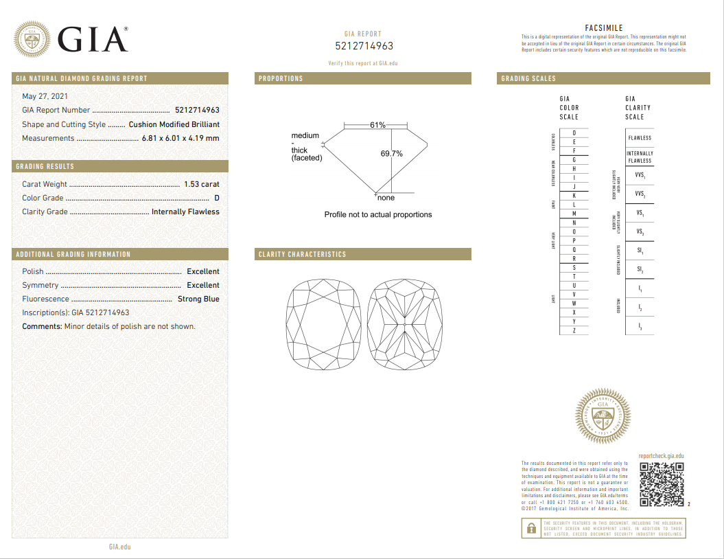 A loose cushion cut Diamond of 1.53ct (With GIA report graded as D IF #5212714963). (New)
