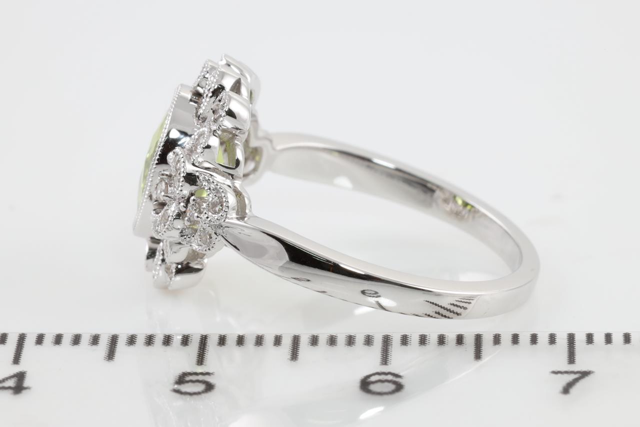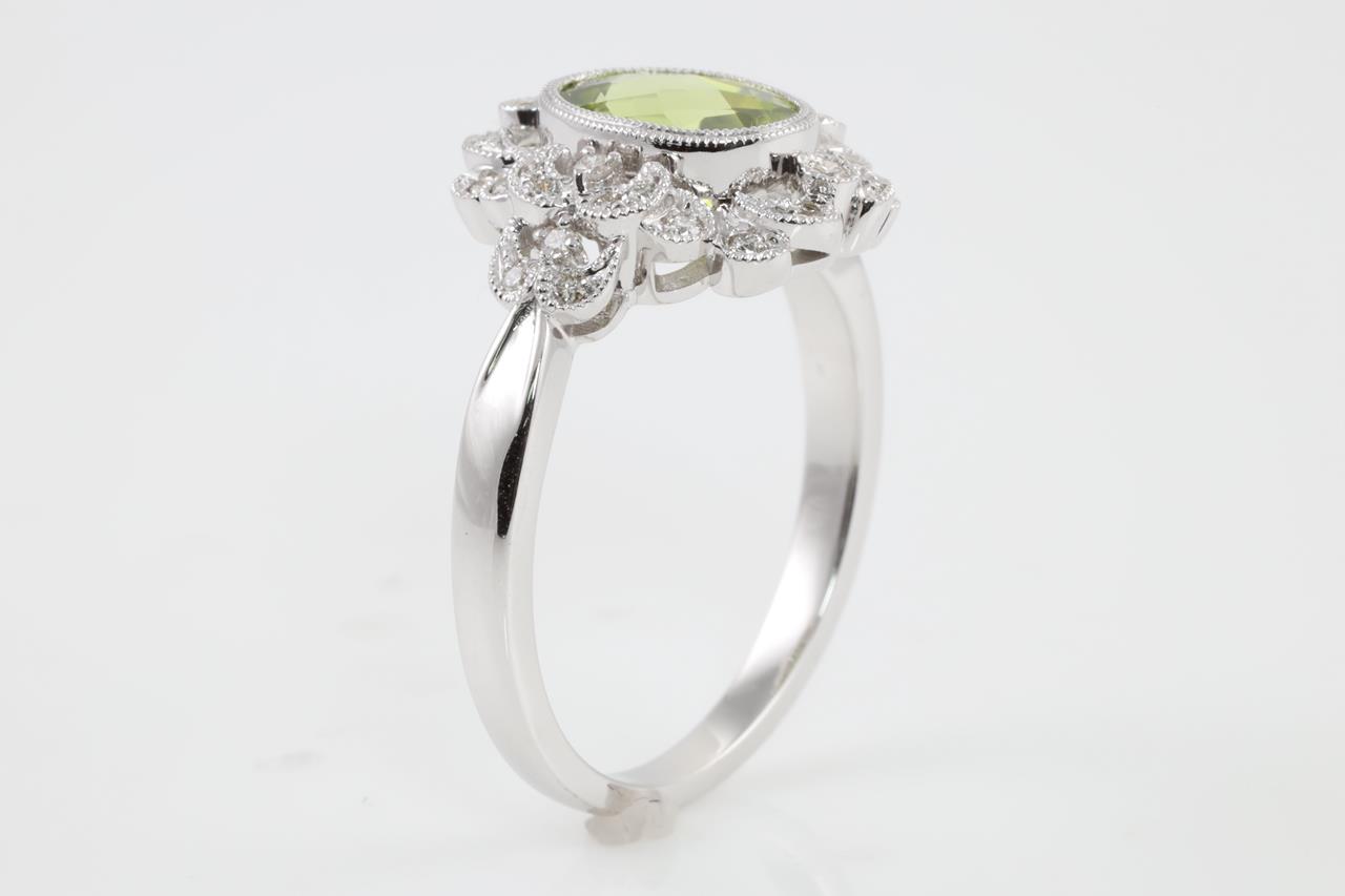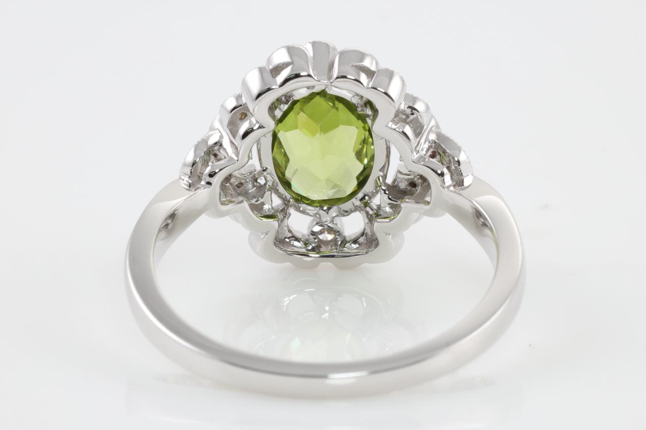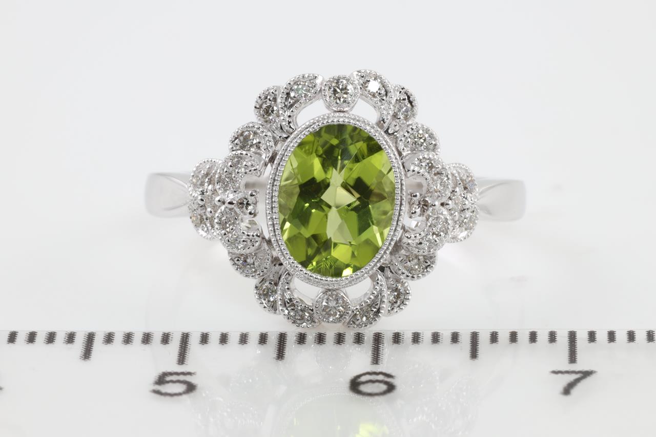 Peridot and Diamond ring with oval Peridot of 1.53ct and Diamonds totalling 0.16cts. 14ct white gold. Ring size N1/2. Weight: 3.8g (New)