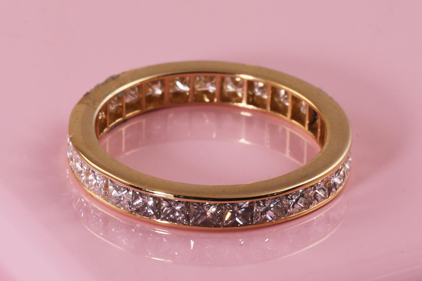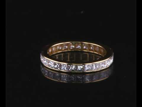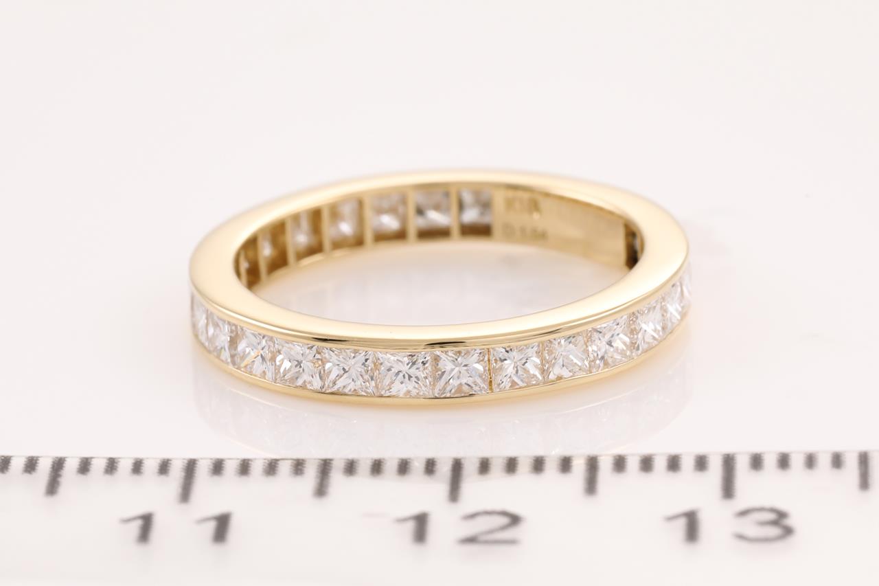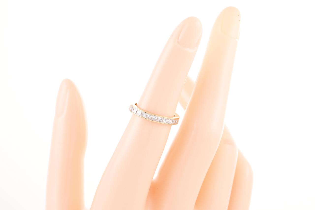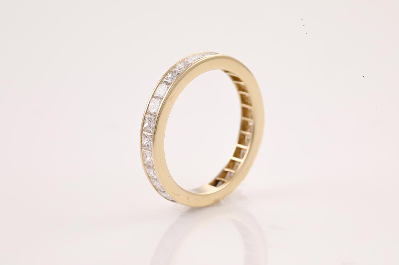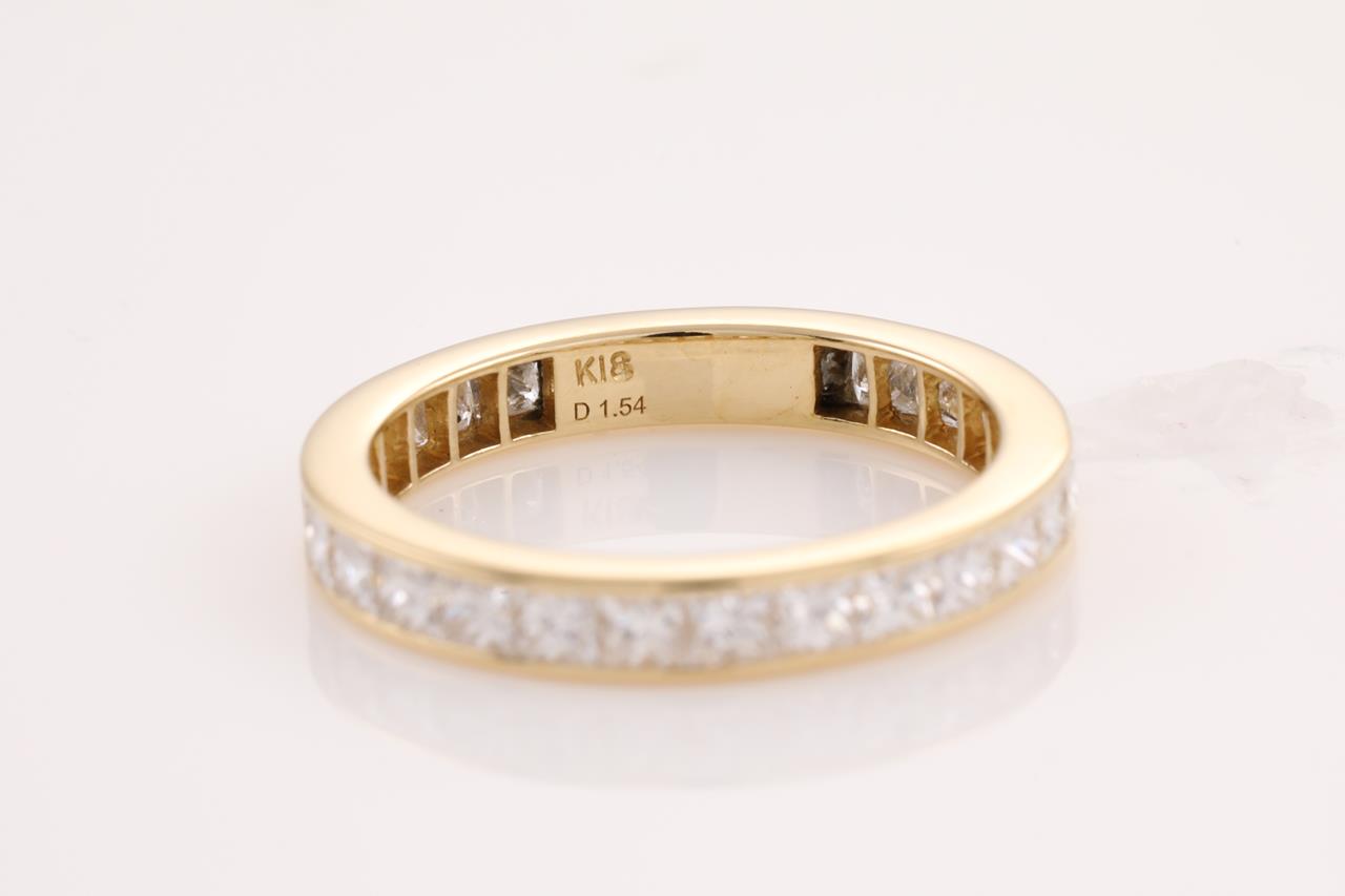 Diamond full hoop eternity Ring with 27 princess cut Diamonds totalling 1.54cts (Estimated grading: H SI). 18ct yellow gold. Ring size J - ring resizing is not recommended. Weight: 2.1g (Pre-owned)