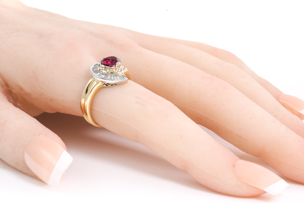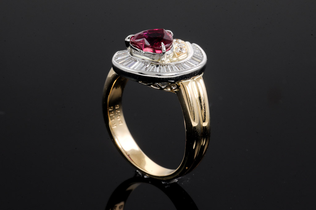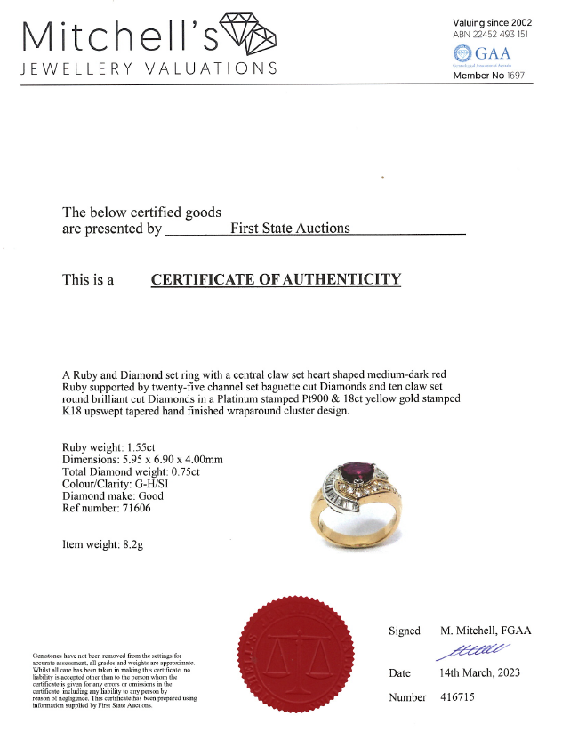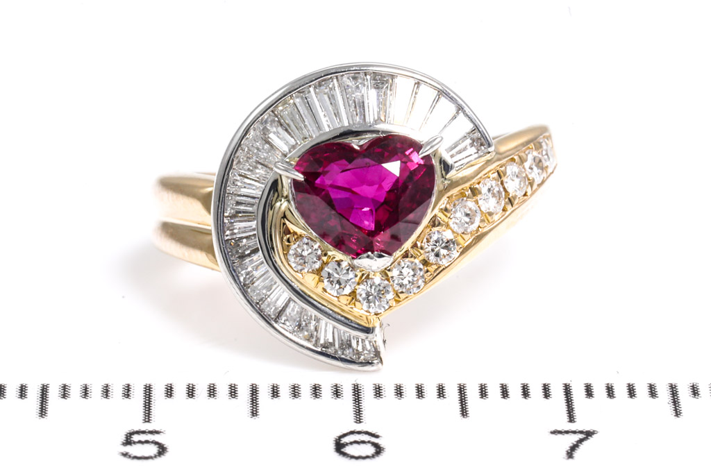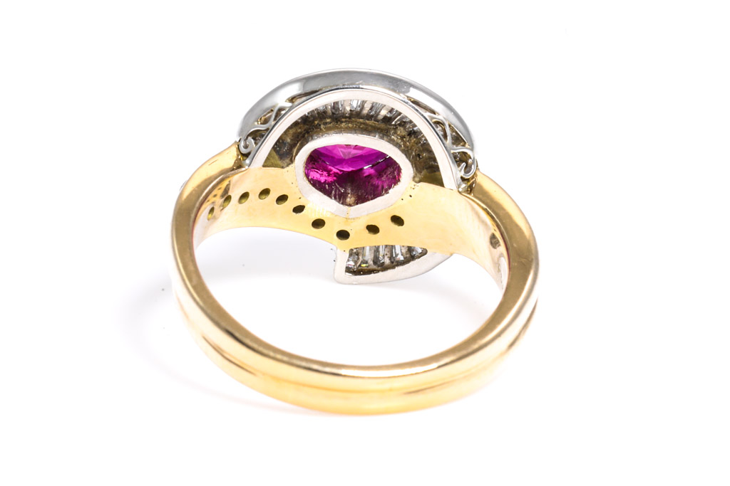 Ruby and Diamond ring with Ruby of 1.55ct and round & baguette cut Diamonds totalling 0.75cts (Estimated grading: G-H SI). 18ct yellow gold and platinum. Ring size M. Weight: 8.2g. With certificate #416715. (Pre-owned)