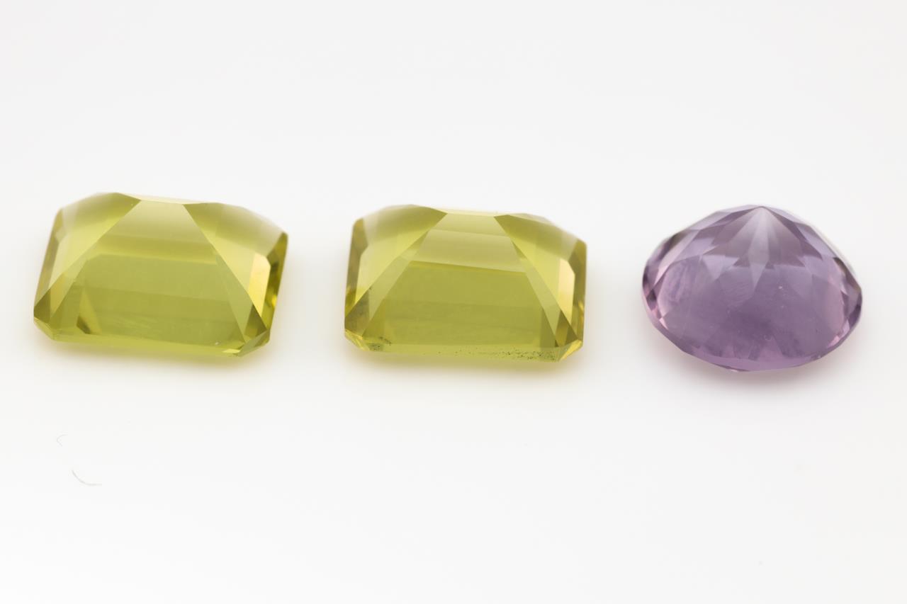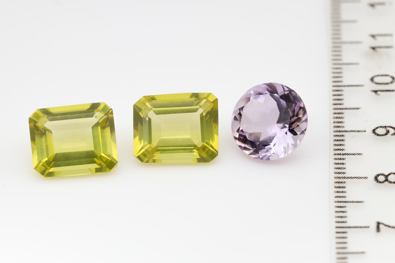 3 Loose gemstones totalling 15.68ct. 2 rectangular cushion Lemon Quartz approx size 12.0 x 10.0 x 6.3mm and round Pink Amethyst approx size 11.1x 7.3mm. (New)