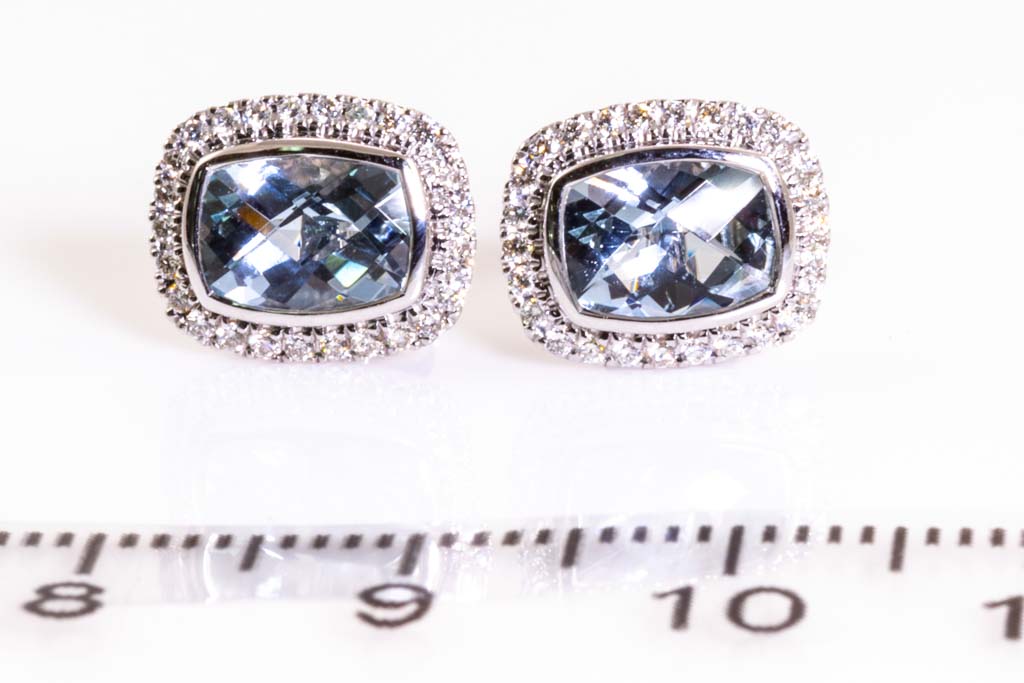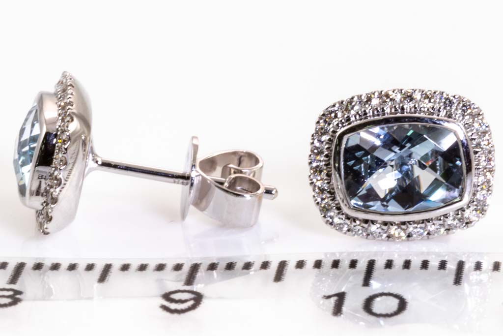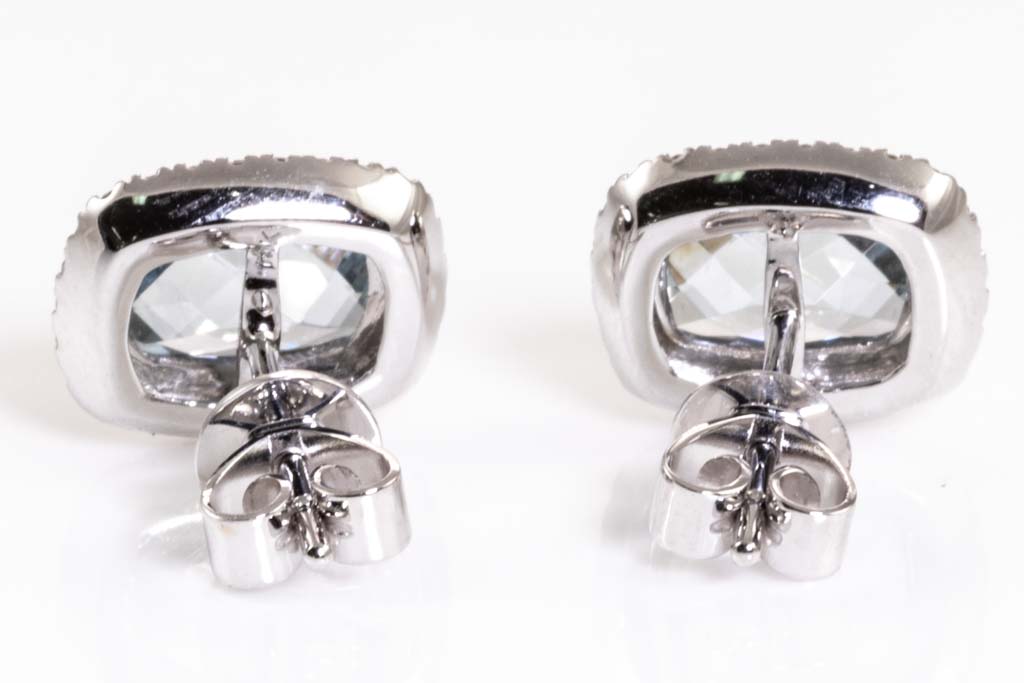 Aquamarine and Diamond earrings with cushion Aquamarine totalling 1.56cts and round Diamonds totalling 0.21cts. 14ct white gold. Weight: 2.6g. (New)