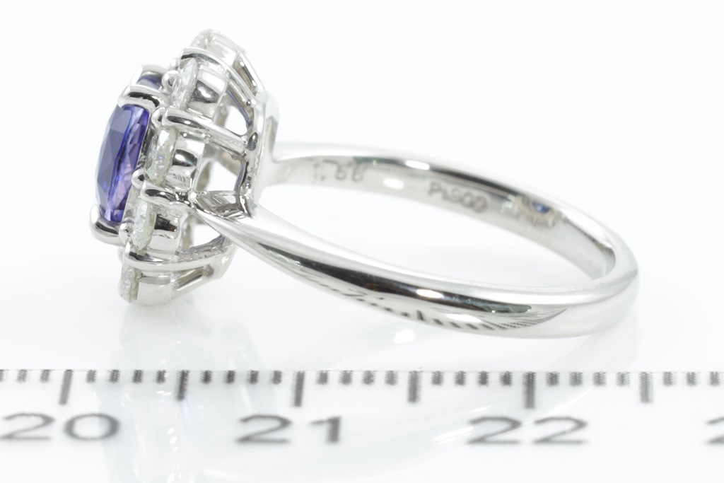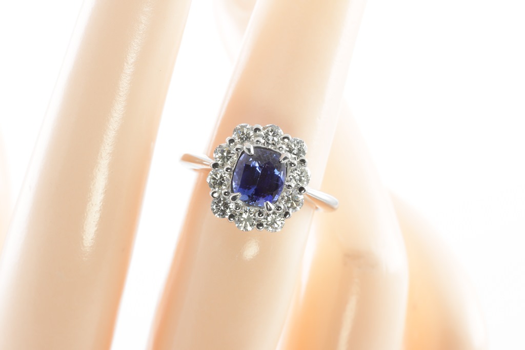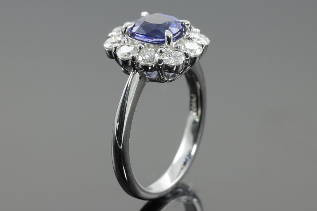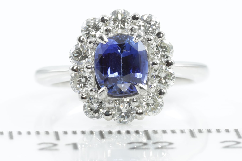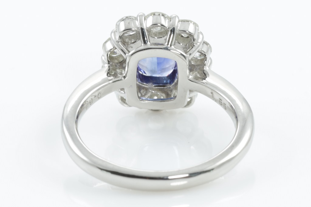 Sapphire and Diamond Ring with a cushion cut blue Sapphire of 1.56ct and Diamonds totalling 0.86cts (Estimated grading: H-I SI). Platinum. Ring size K1/2. Weight: 6.9g. (Pre-owned)