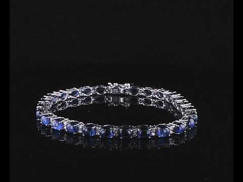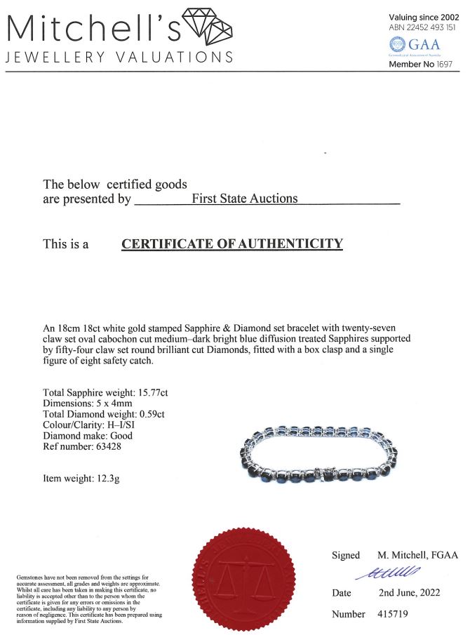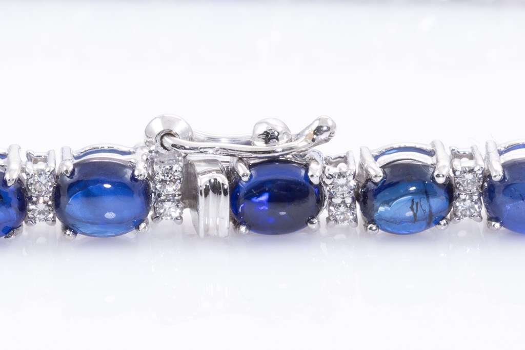 Sapphire Bracelet with oval cabochon cut blue diffusion treated natural Sapphires totalling 15.77cts and round Diamonds totalling 0.59cts (Estimated grading: H-I SI). 18ct white gold. Length: 18cm. Weight: 12.3g. With certificate #415719. (Pre-owned)