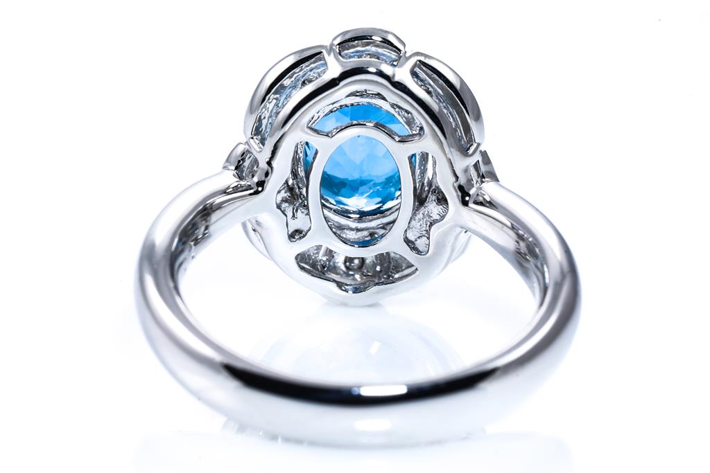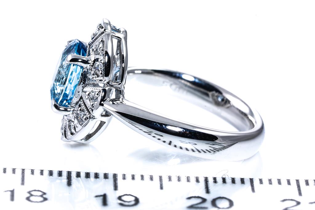 Aquamarine and Diamond ring oval with an oval shape Aquamarine of 1.57ct and round Diamonds totalling 0.15cts. Platinum. Ring size L. Weight: 8.9g. (Pre-owned)