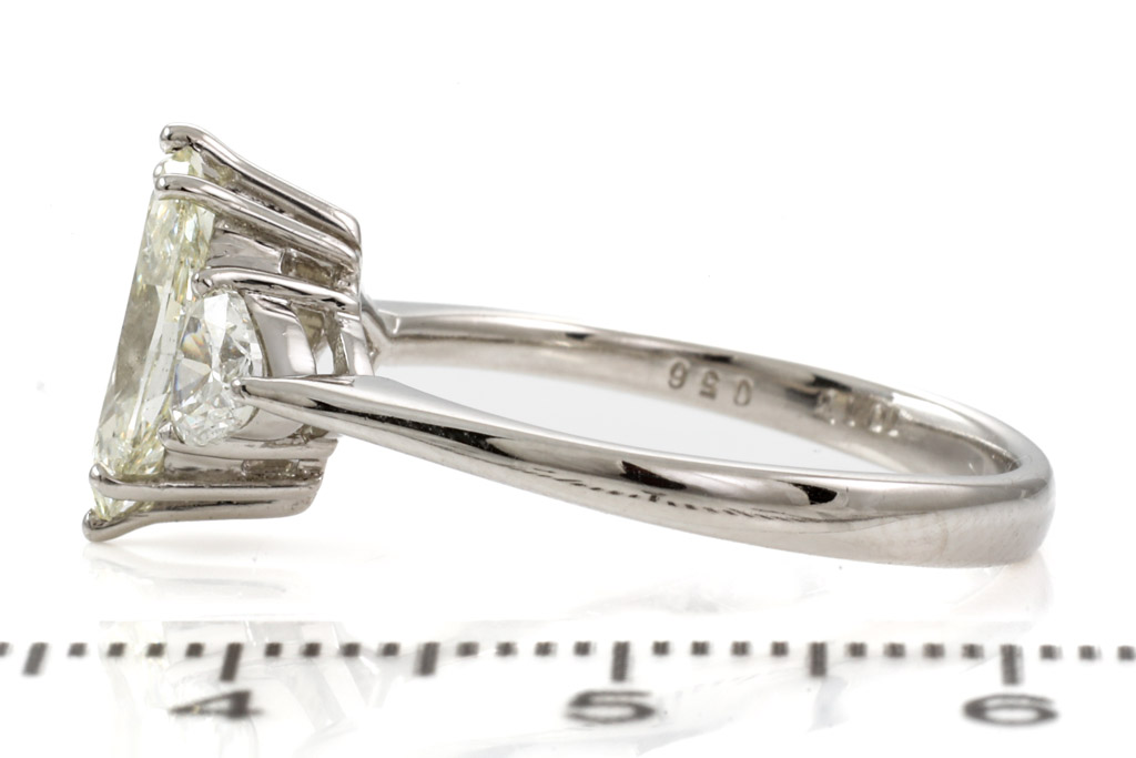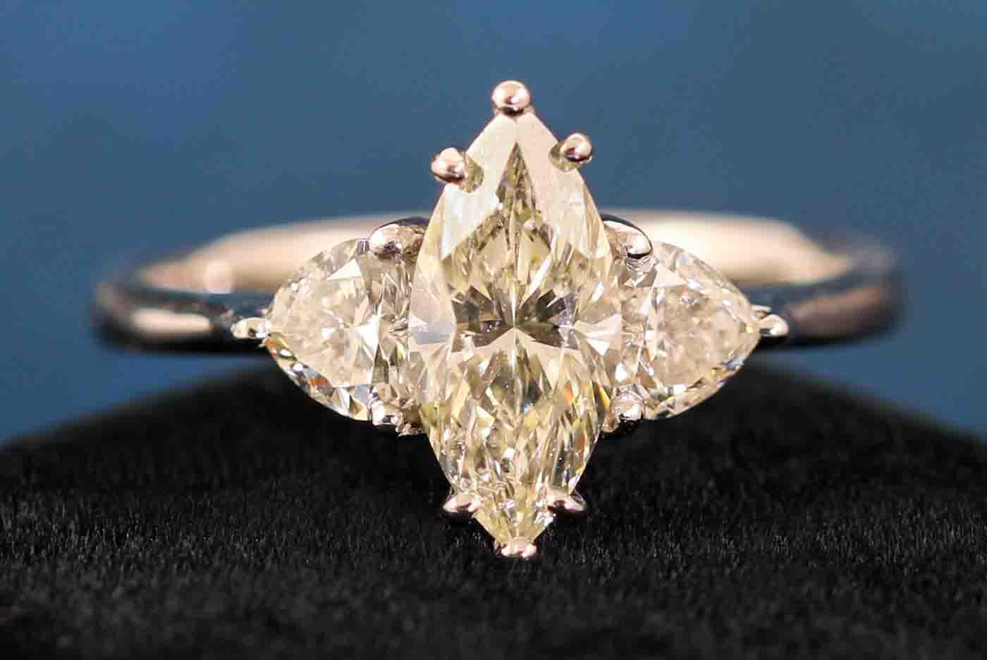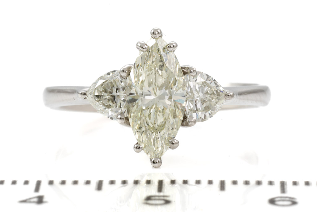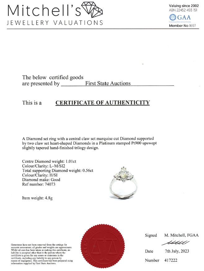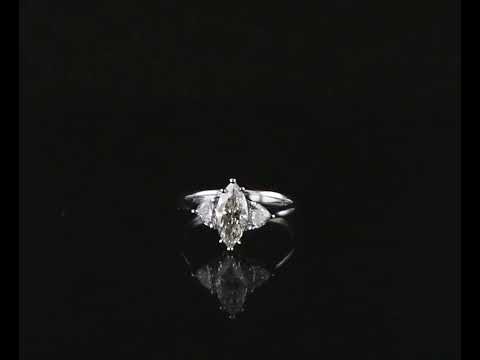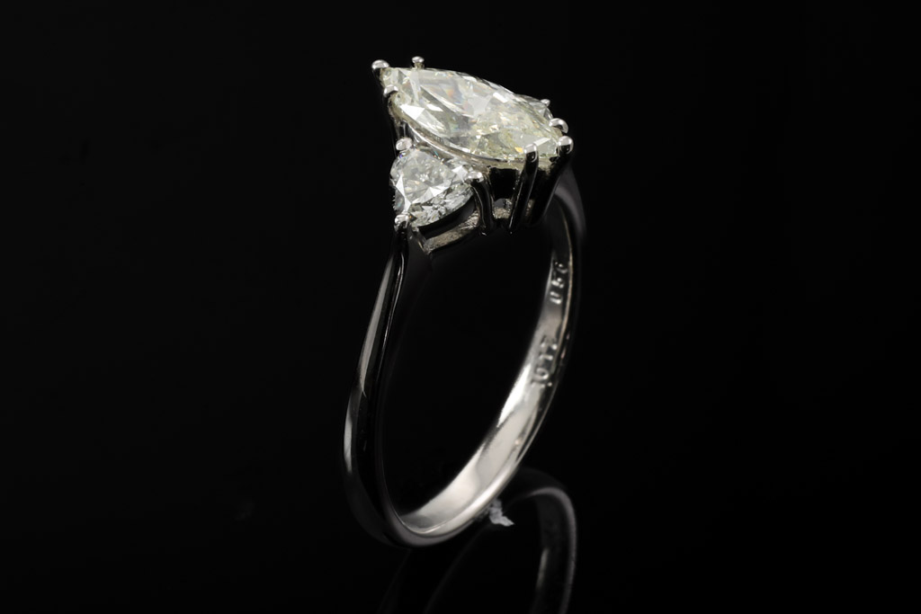 Diamond trilogy ring with a centre marquise cut Diamond of 1.01ct (Estimated grading: L-M SI2) and two heart shape Diamonds totalling 0.56cts (Estimated grading H SI) . Platinum - 900. Ring size N1/2. Weight: 4.8g. With certificate #417222. (Pre-owned)