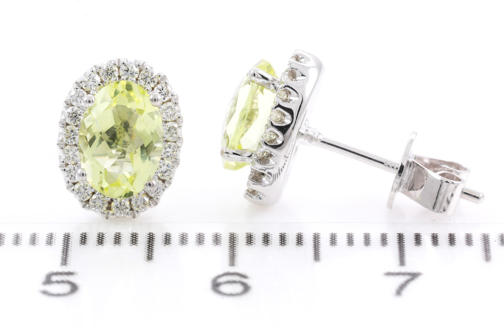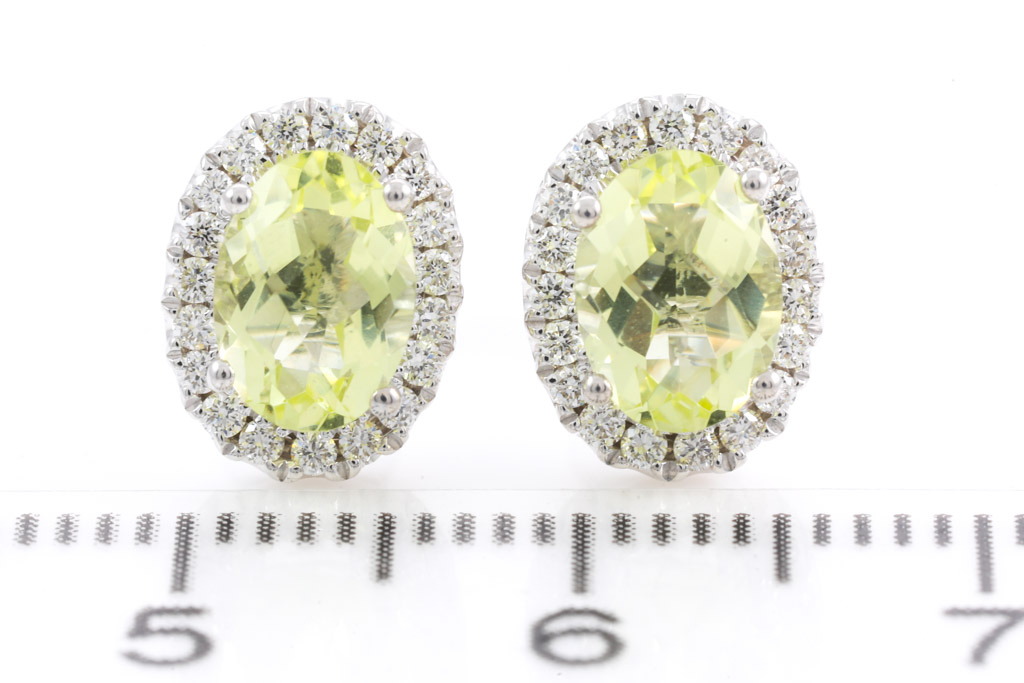 Quartz and Diamond earrings with oval shape Lemon Quartz totalling 1.57cts and round Diamonds totalling 0.25cts. 14ct white gold. Weight: 2.6g. (New)