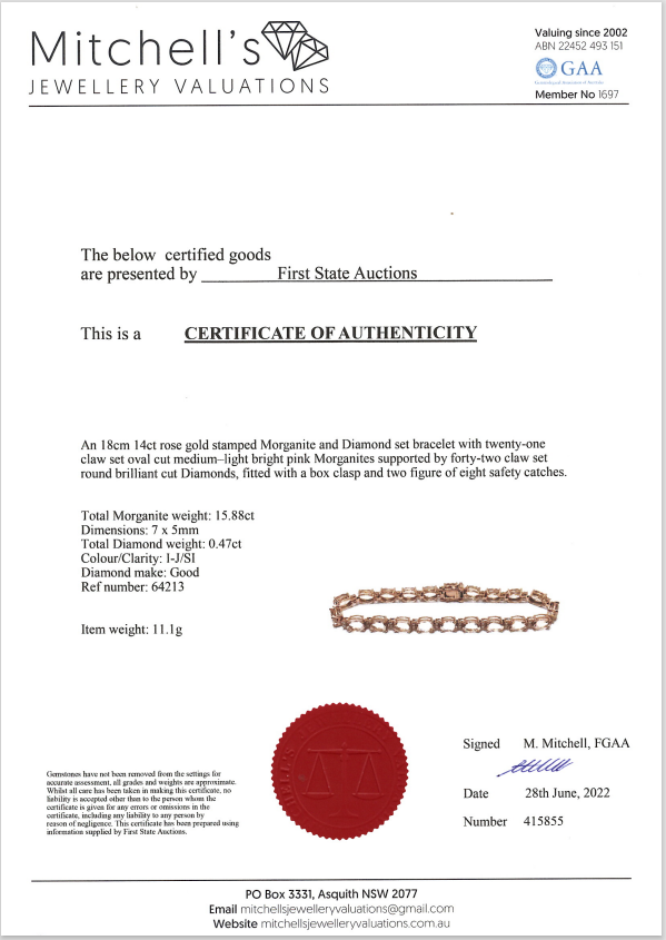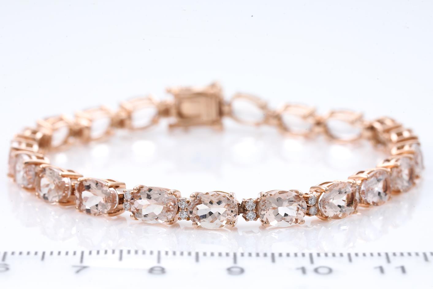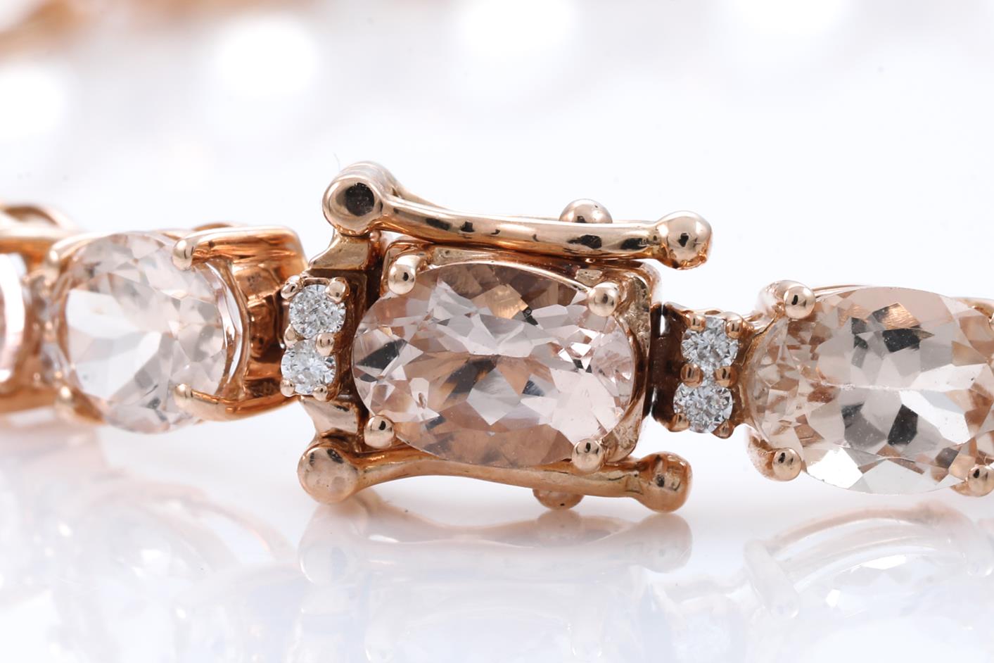 Morganite and Diamond bracelet with oval Morganite totalling 15.88ct and round Diamonds totalling 0.47cts (Estimated grading: I-J SI). 14ct rose gold. Length: 18cm. Weight: 11.1g. With certificate #415855. (As new)