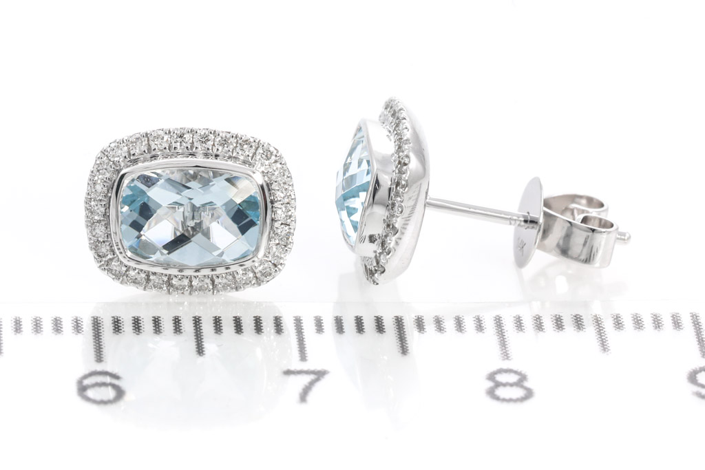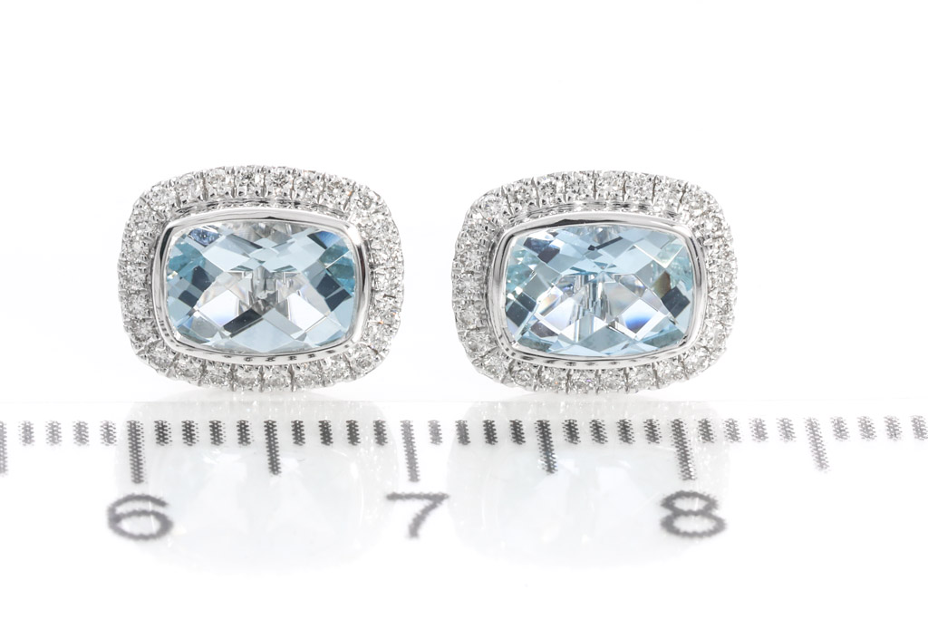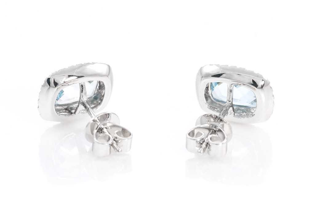 Aquamarine and Diamond earrings with cushion cut Aquamarines totalling 1.58cts and round Diamonds totalling 0.24cts. 14ct white gold. Weight: 2.4g. (New)