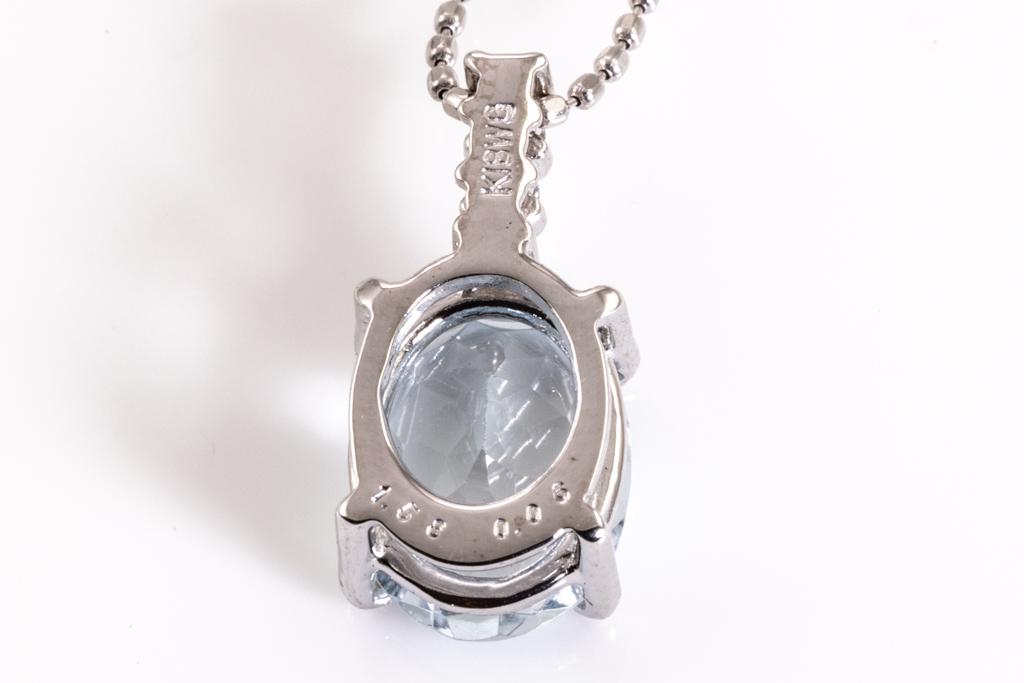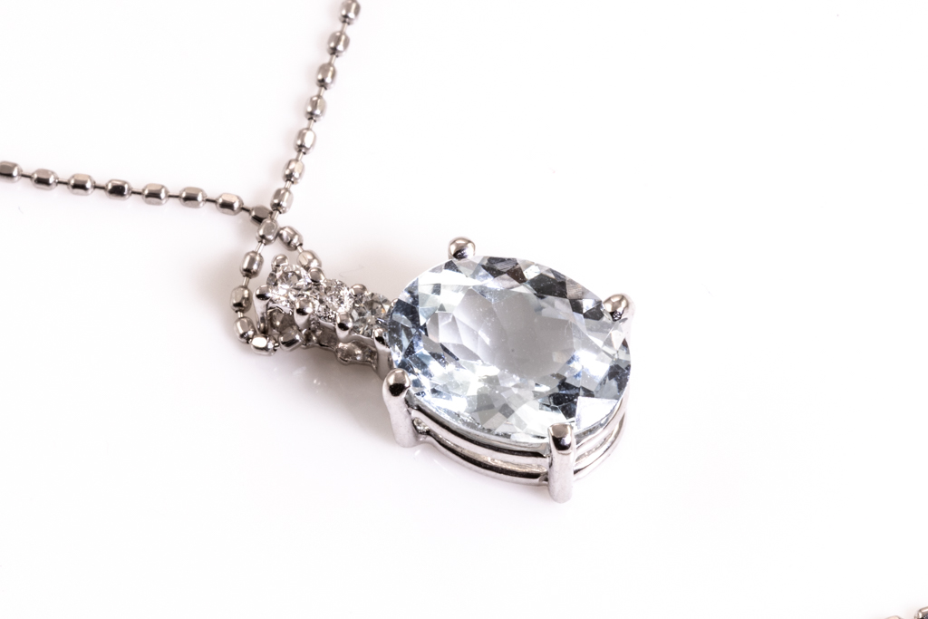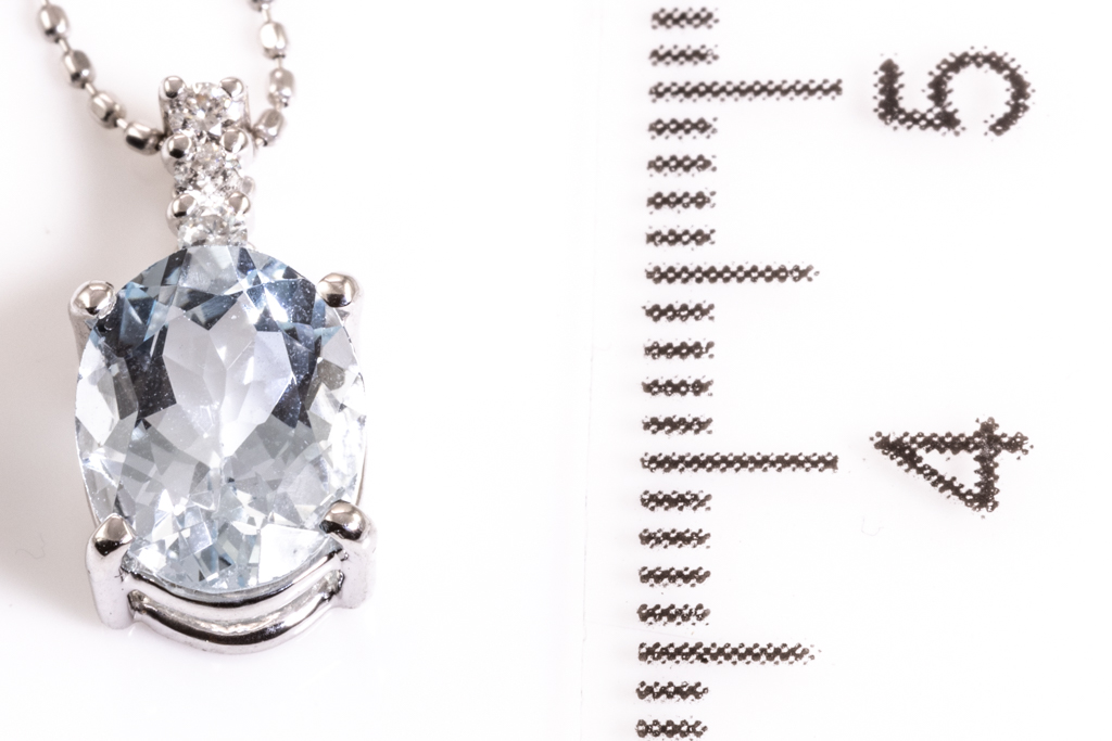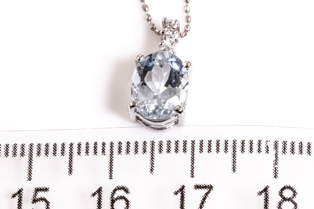Aquamarine and Diamond pendant with an oval shape Aquamarine of 1.58ct and 3 round Diamonds totalling 0.06cts. 18ct white gold with 45cm adjustable 18ct white gold chain. Weight: 2.5g. (Pre-owned)