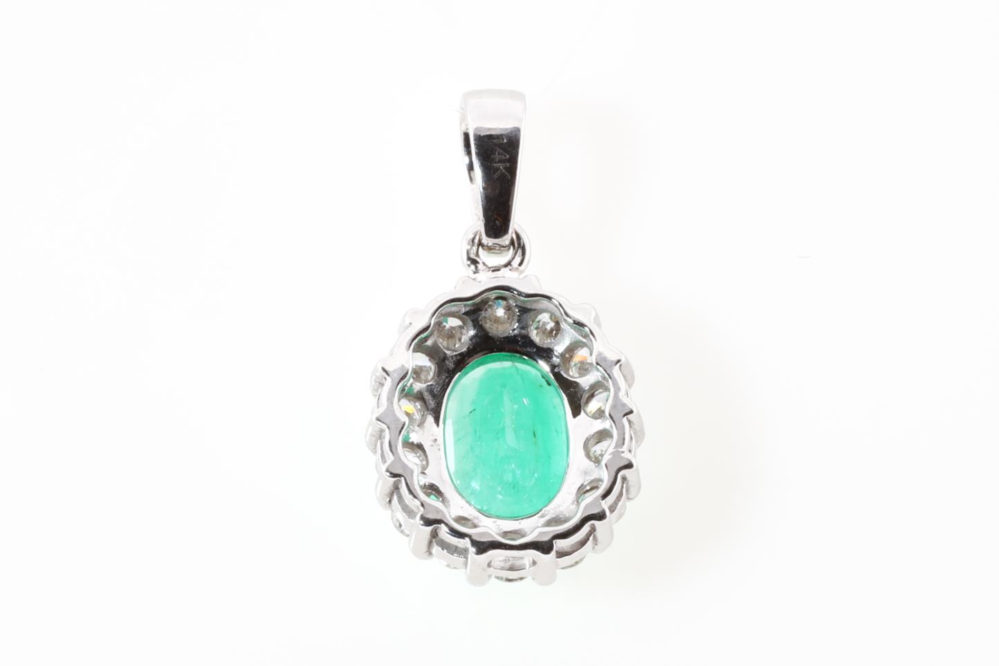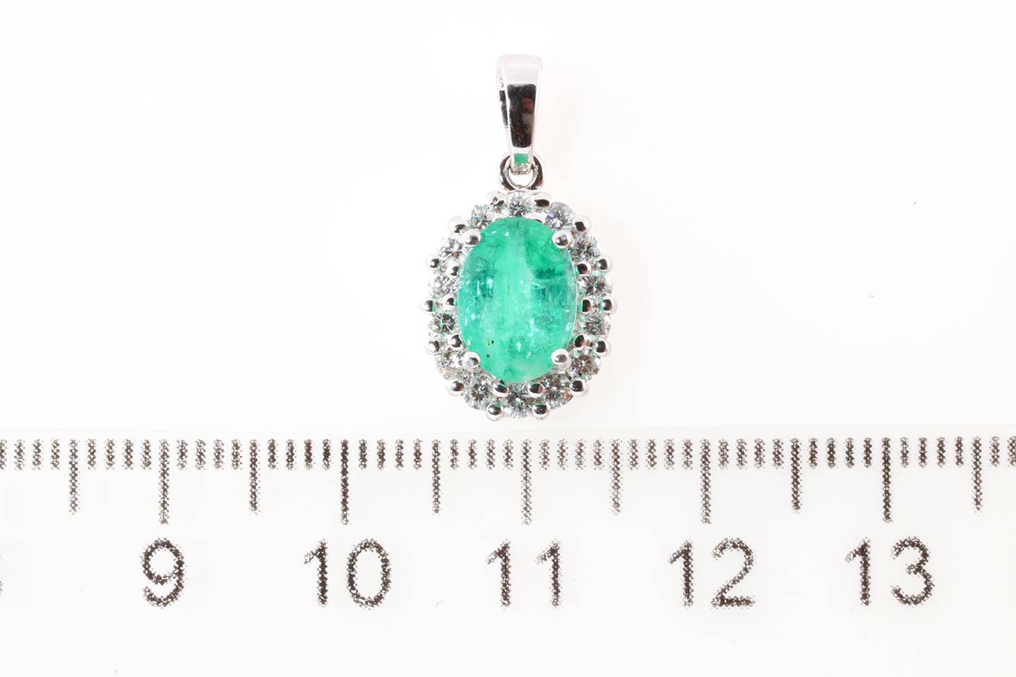 Emerald and Diamond pendant with an oval Emerald of 1.58ct and round Diamonds totalling 0.41cts (Estimated grading: H-I SI). 14ct white gold. No chain provided. Weight: 2.0g (As New).