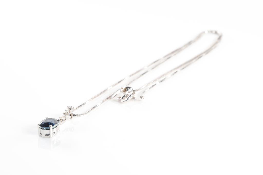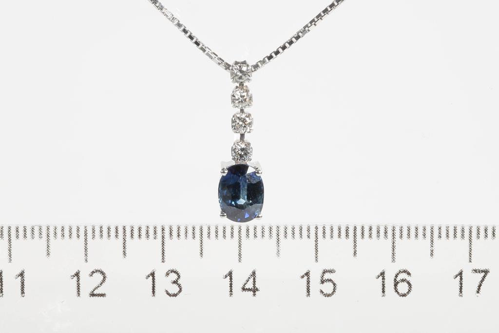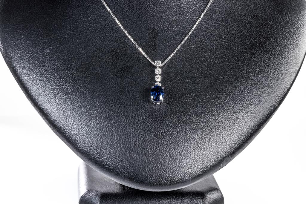 Sapphire and Diamond pendant with an oval Sapphire of 1.58ct and Diamonds totalling 0.27cts. 18ct white gold with adjustable 45cm chain. Weight: 4.8g (Pre-owned)