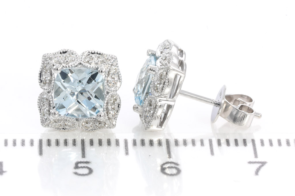 Aquamarine and Diamond earrings with cushion Aquamarine totalling 1.59cts and round Diamonds totalling 0.22cts. 14ct white gold. Weight: 3.4g. (New).