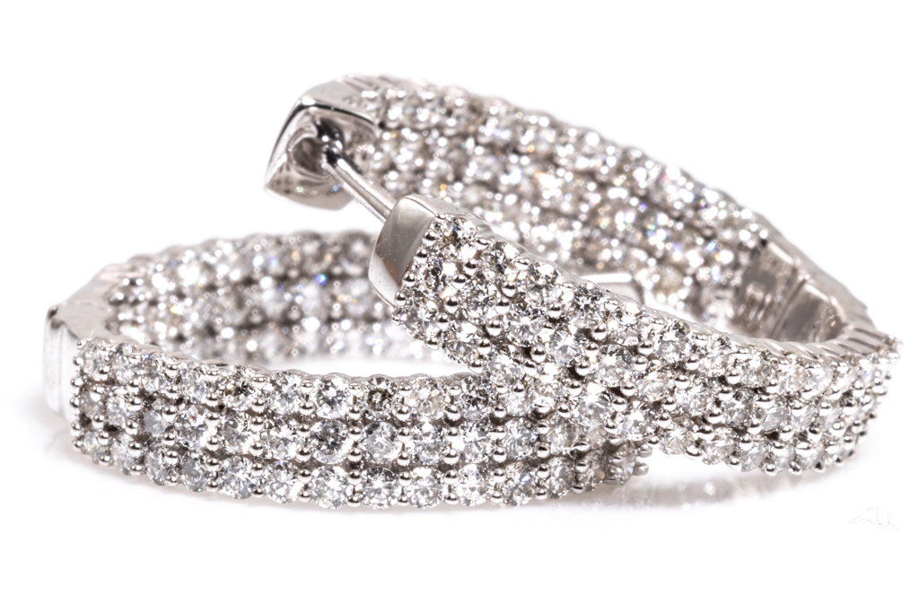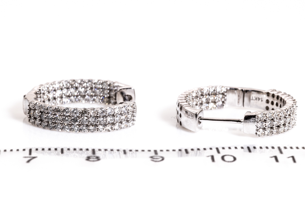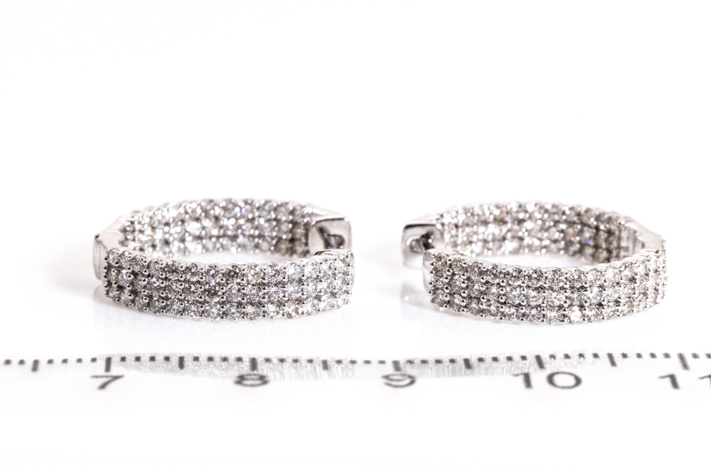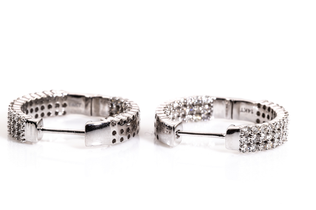Diamond hoop earrings with 150 round diamonds totalling 1.59cts. (Estimated grading: H SI). Back of the hoop has the Diamonds set inside the hoop. 14ct white gold. Weight: 6.5g. (New)