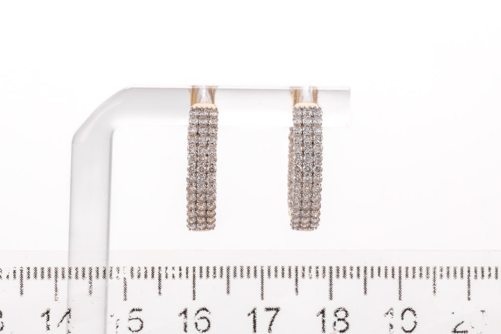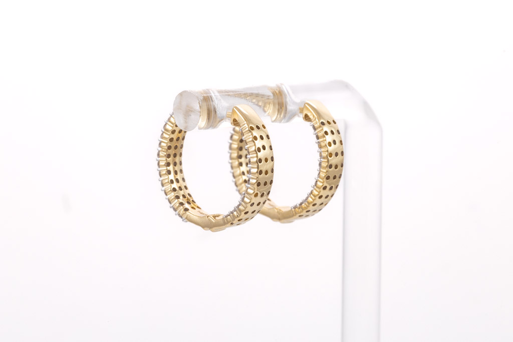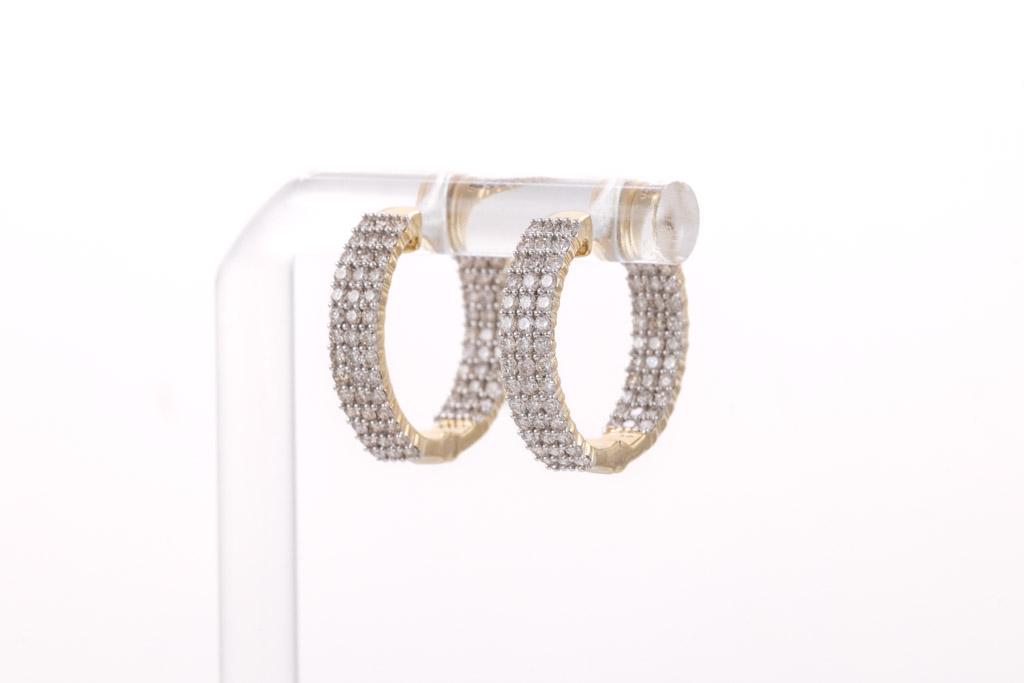 Diamond hoop earrings with 150 round diamonds totalling 1.59cts. (Estimated grading: H SI). Back of the hoop has the Diamonds set inside the hoop. 14ct yellow gold. Weight: 6.3g. (New)
