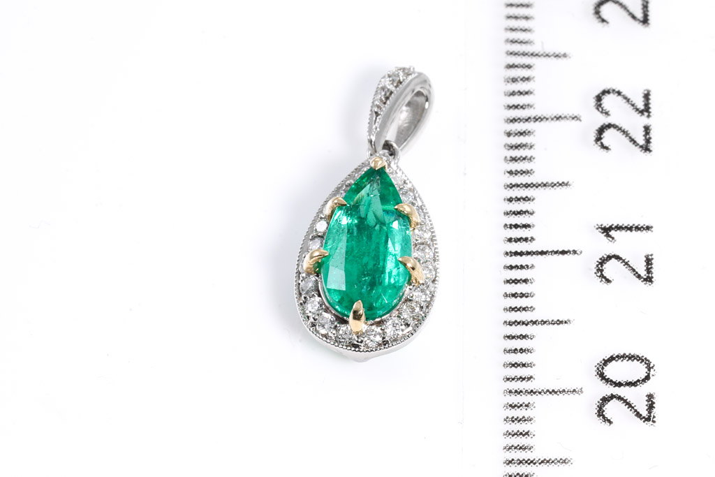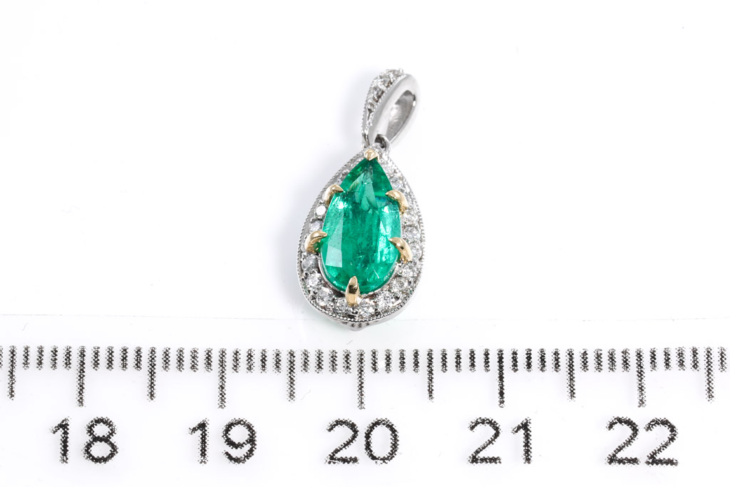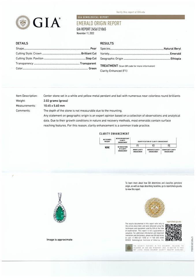 Emerald and Diamond pendant with pear cut Ethiopia Emerald of 1.59ct and round Diamonds totalling approximately 0.29cts. 14ct white yellow gold. Weight 2.0g. No chain provided. With GIA Origin report #2456121065. (As New)
