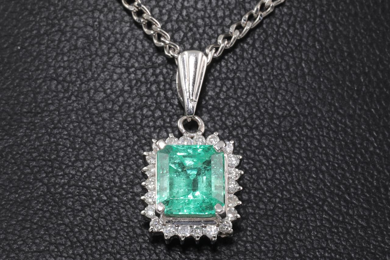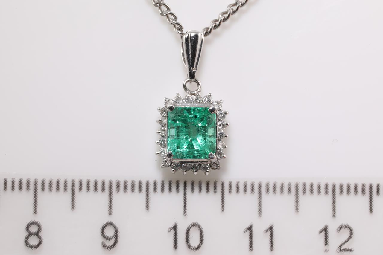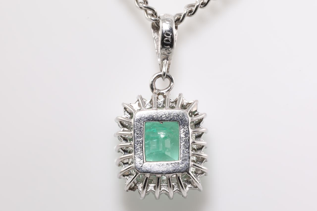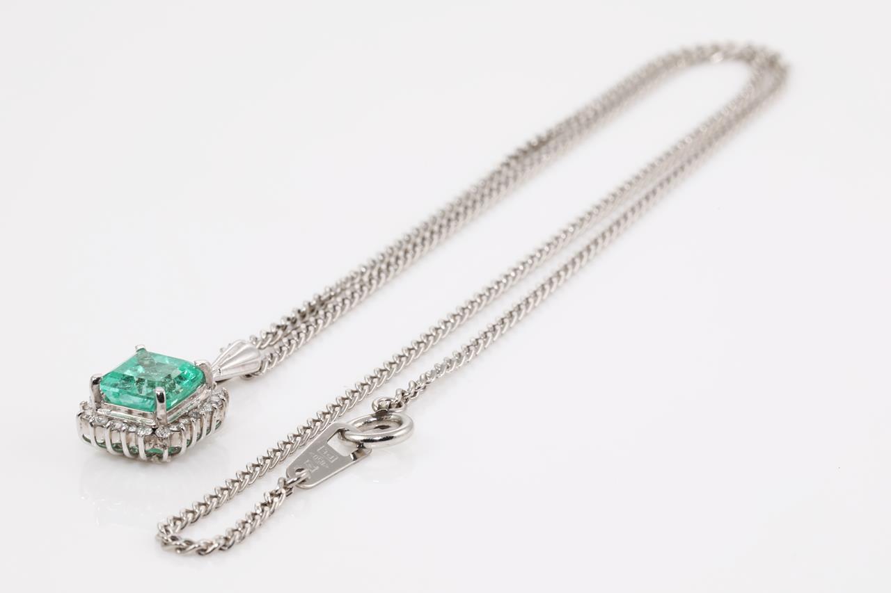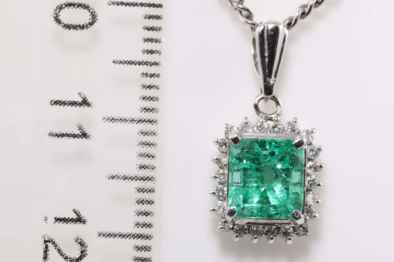 Emerald and Diamond Pendant with emerald cut Emerald of 1.50ct and Diamonds totalling 0.18cts. Platinum with 40cm chain. Weigth: 7.7g (Pre-owned)