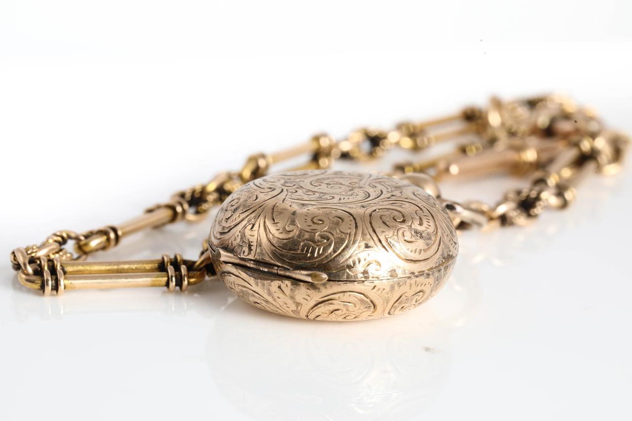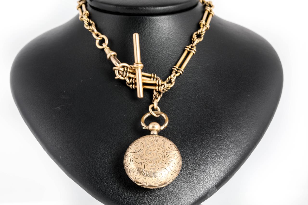 15ct rose gold Fob Chain with gold plated Dennisson Sovereign case. Length chain 34.5cm. Weight chain 30g. (Pre-owned)