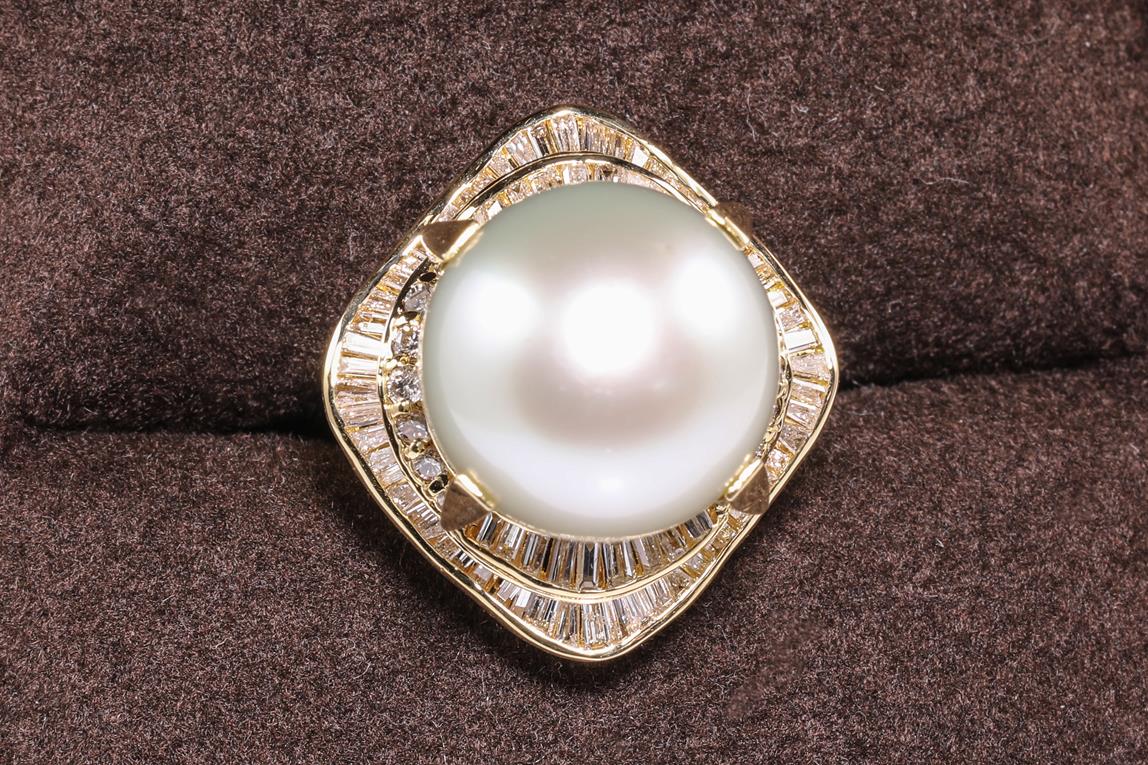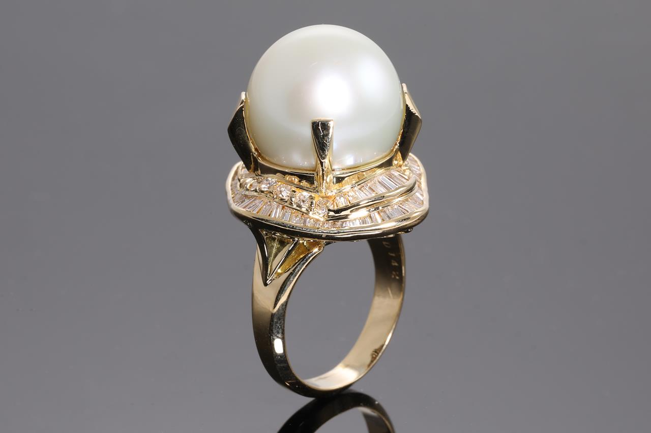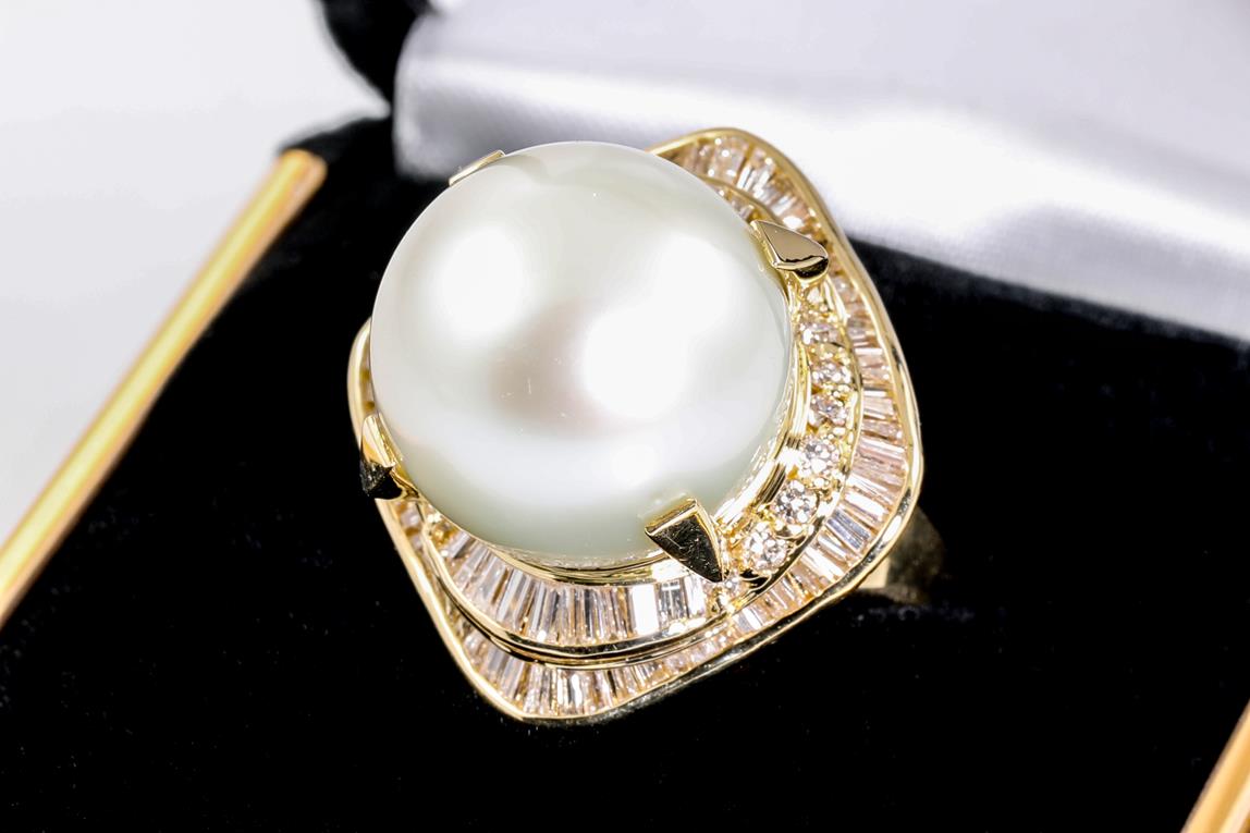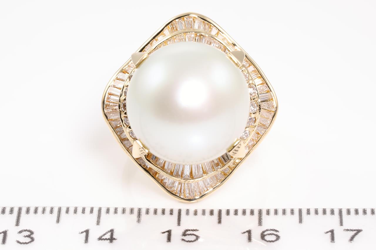 Pearl and Diamond ring with a South Sea Pearl of 15mm and Diamonds totalling 1.42cts (Estimated grading: H-I VS-SI). 18ct yellow gold. Ring size L1/2. Weight: 16.7g (Pre-owned)