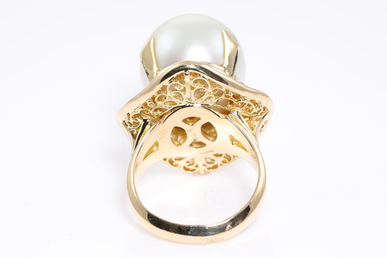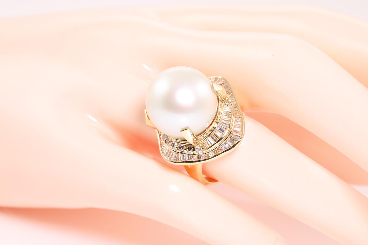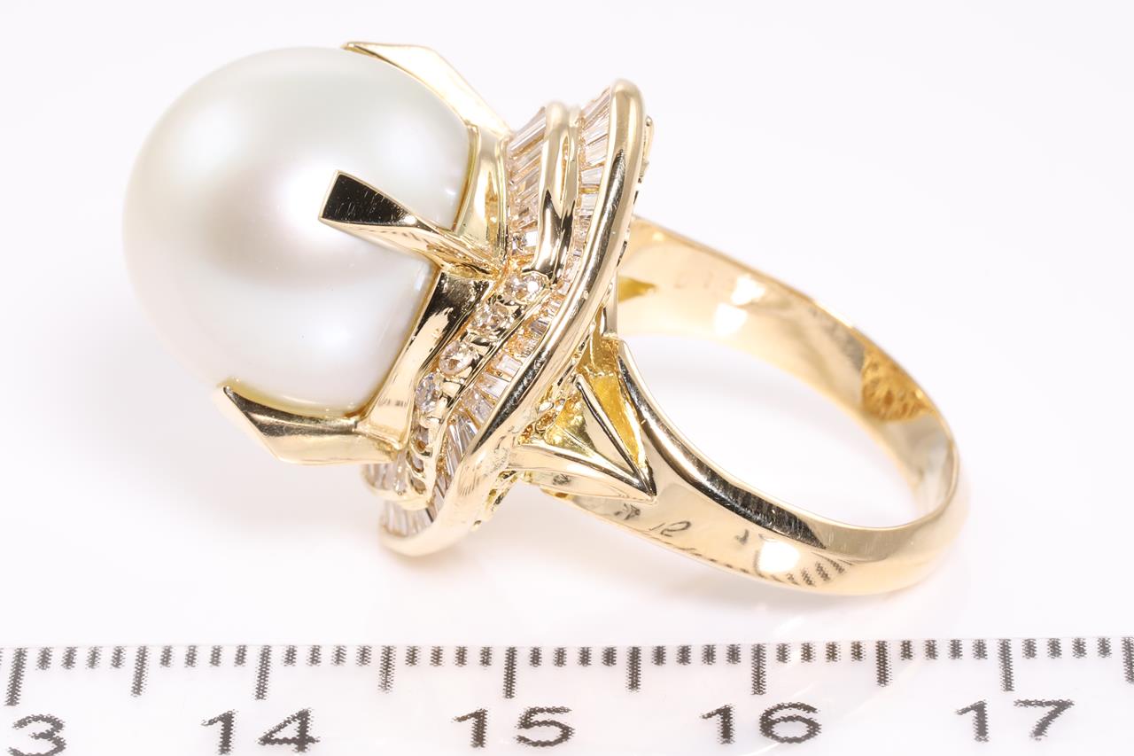 Pearl and Diamond ring with a South Sea Pearl of 15mm and Diamonds totalling 1.42cts (Estimated grading: H-I VS-SI). 18ct yellow gold. Ring size L1/2. Weight: 16.7g (Pre-owned)