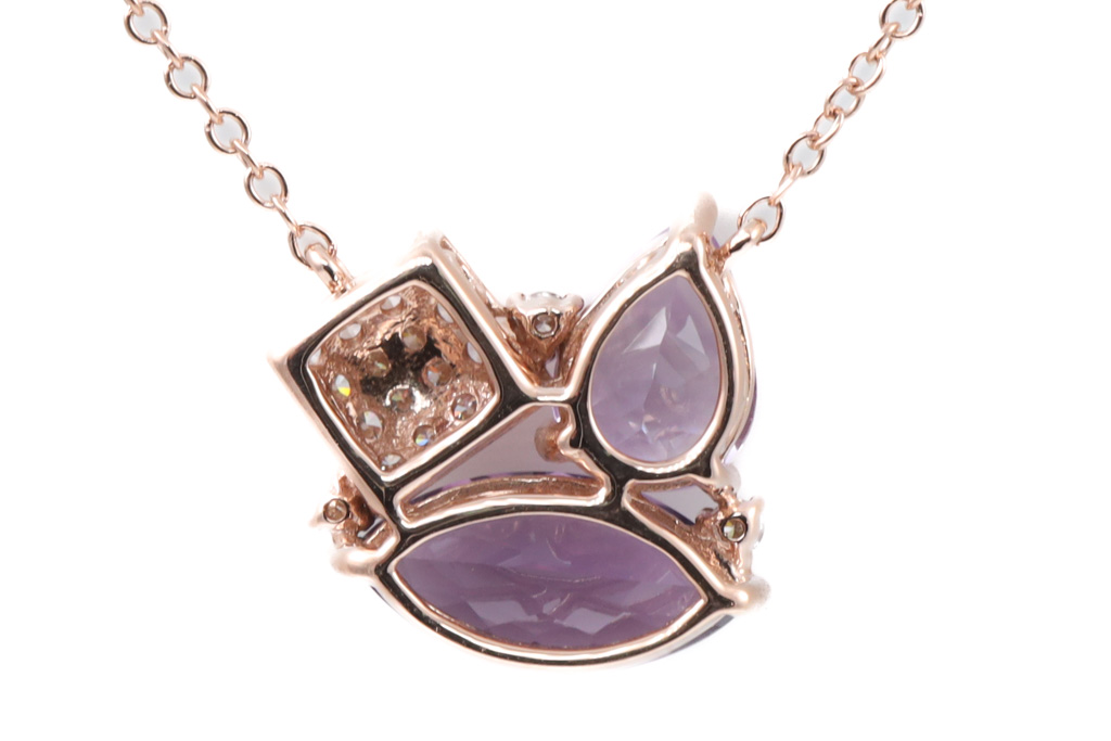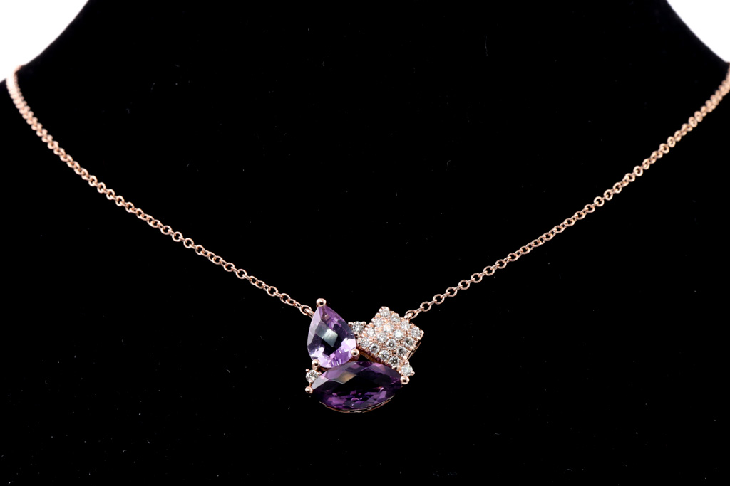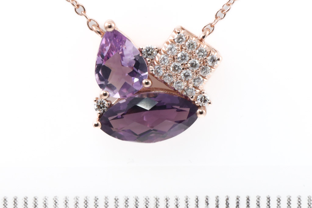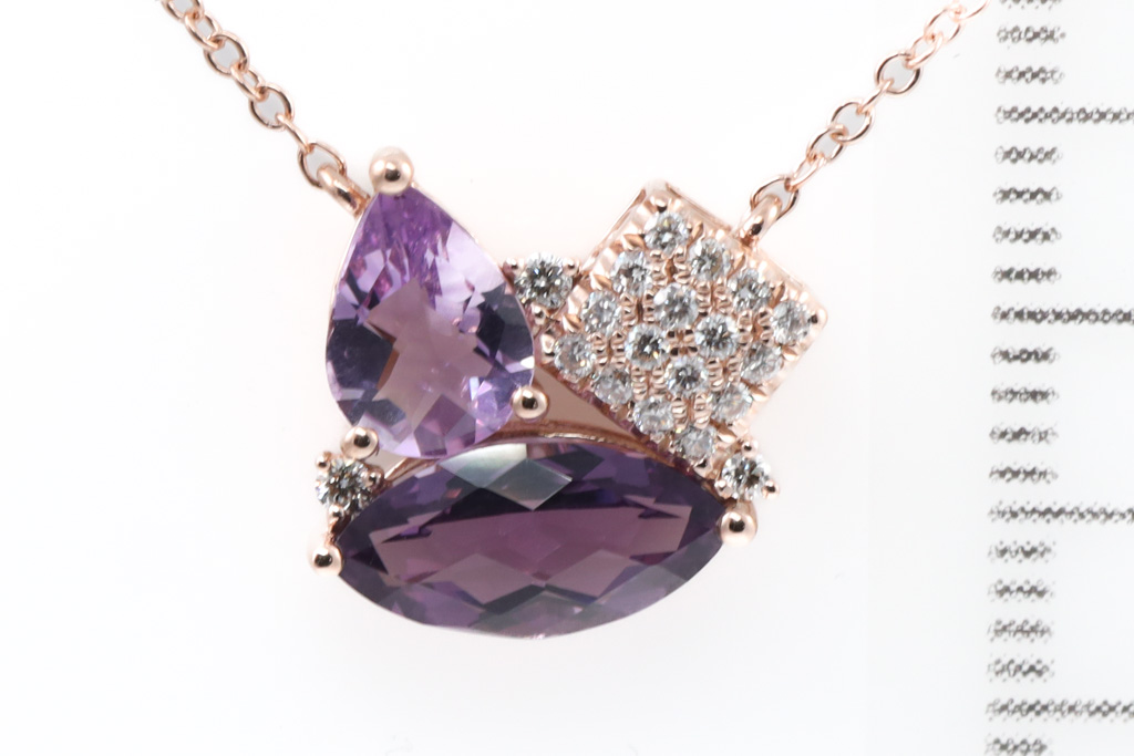 Amethyst and Diamond pendant with pear shape and marquise cut Amethyst totalling 1.60cts and Diamonds totalling 0.14cts. 14ct rose gold with 14ct rose gold 45cm adjustable chain. Weight: 3.0g. (New)