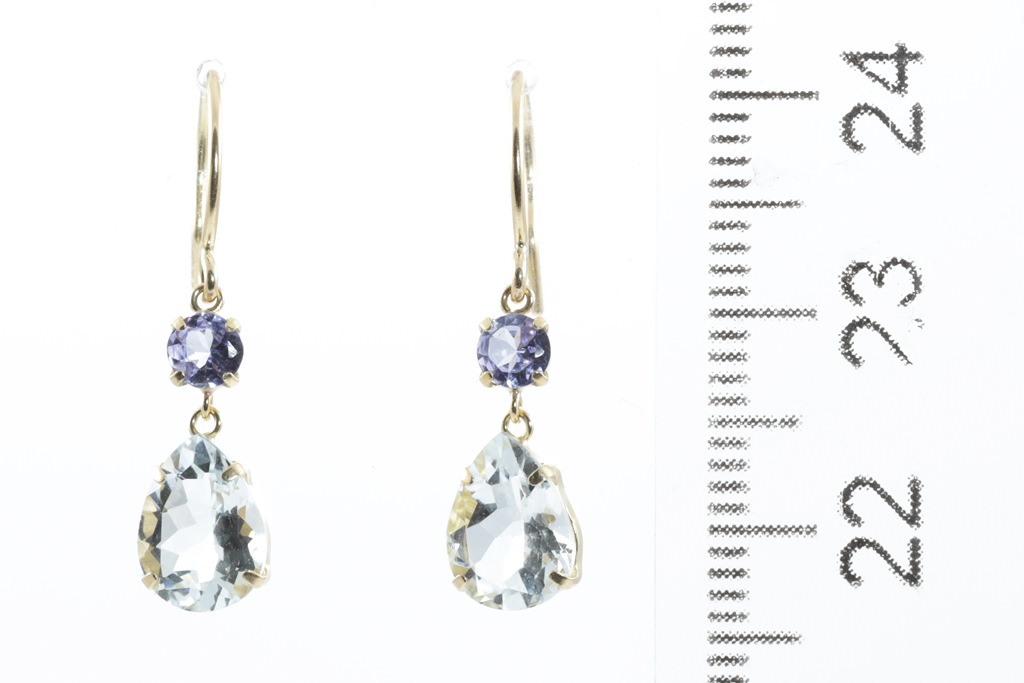 Aquamarine and Tanzanite shepherd hook earrings with 2 pear shape Aquamarines totalling 1.60cts and 2 round Tanzanite totalling 0.30cts. 18ct yellow gold. Weight: 1.1g (Pre-owned)