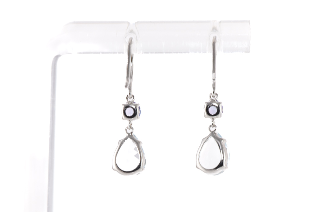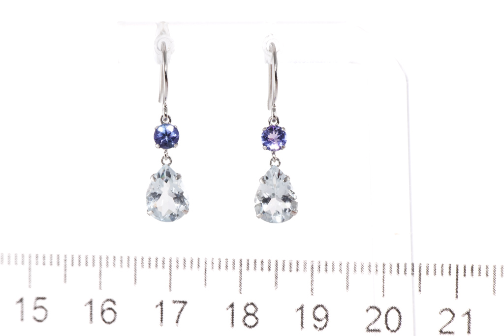 Aquamarine and Tanzanite shepherd hook earrings with pear shape Aquamarines totalling 1.60cts and round Tanzanites totalling 0.30cts. Platinum-900 with silicon backs. Weight: 1.4g. (Pre-owned)