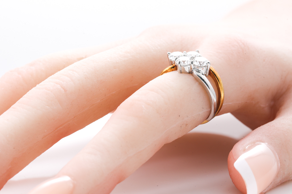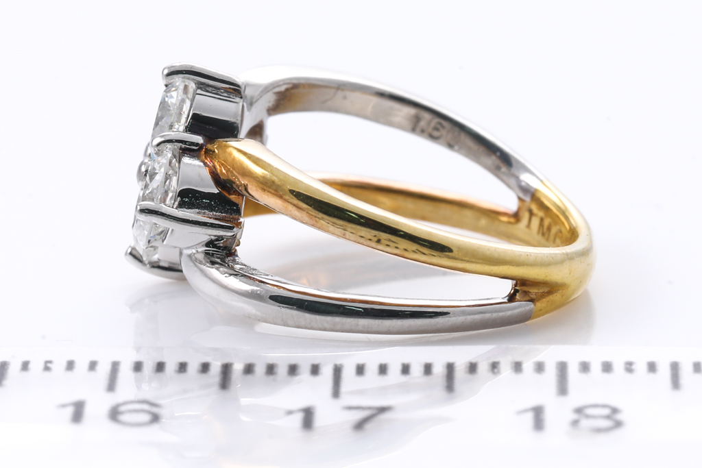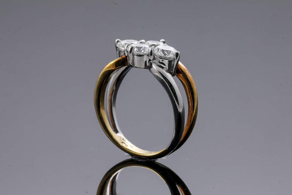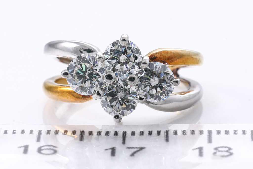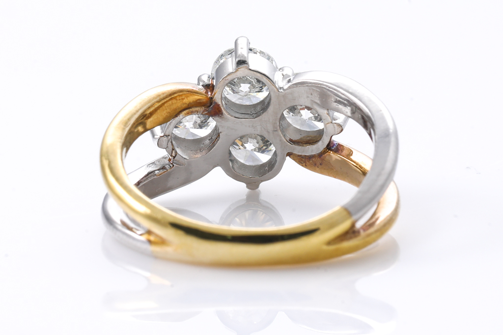 Diamond crossover ring with four round cut Diamonds totalling approximately 1.60cts (Estimated grading H-I SI-P1). 18ct yellow gold and platinum. Ring size K - not resizing recommended. Weight 6.4g. (Pre-owned)