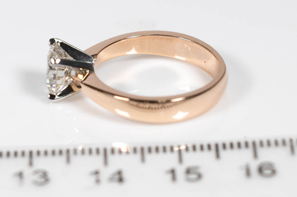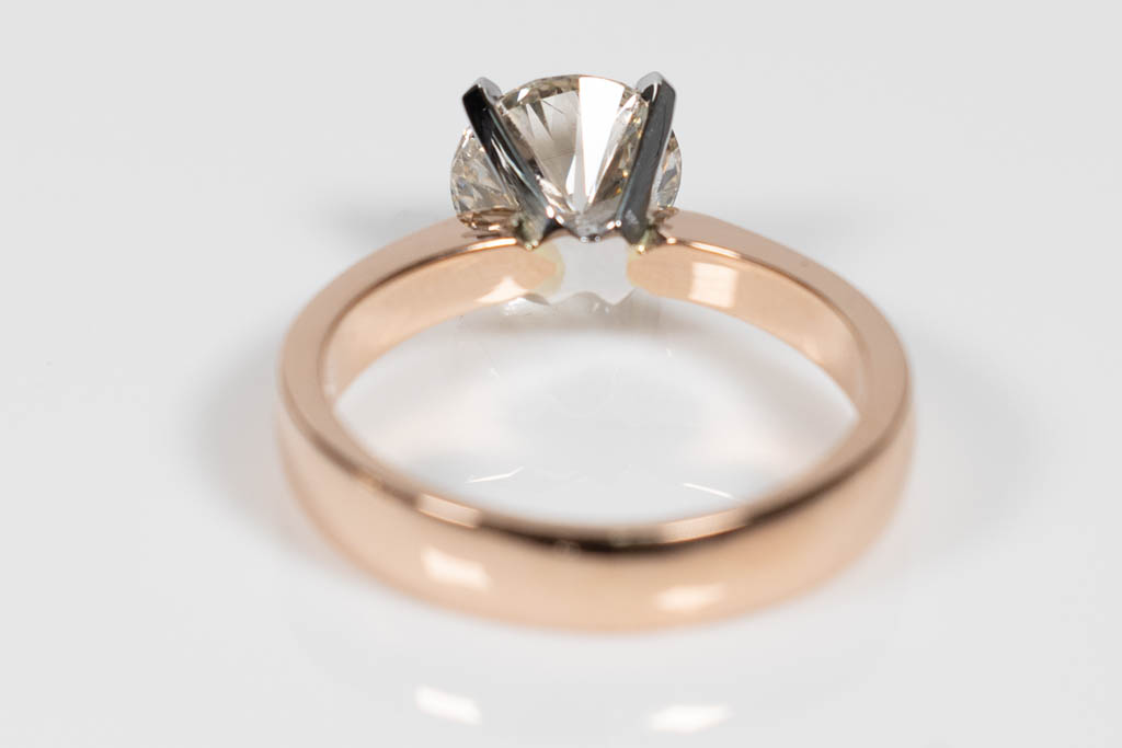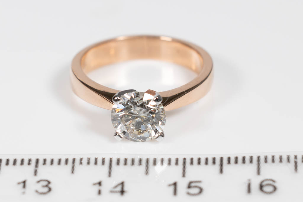 Diamond solitaire ring with round brilliant cut Diamond of 1.60ct (with GIA report graded as J P1 #1175744158). 18ct rose and white gold. Ring size: M. Weight: 5.3g. (New)