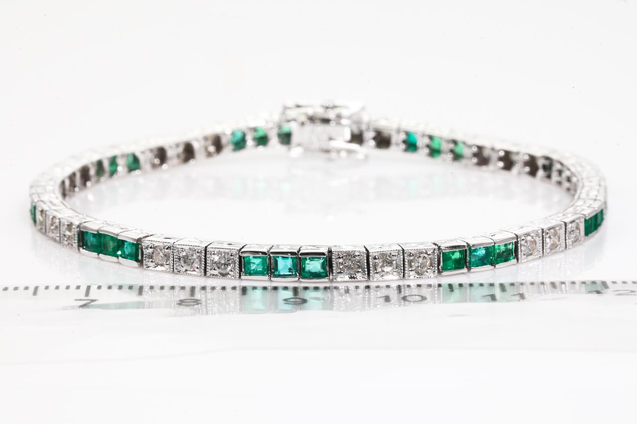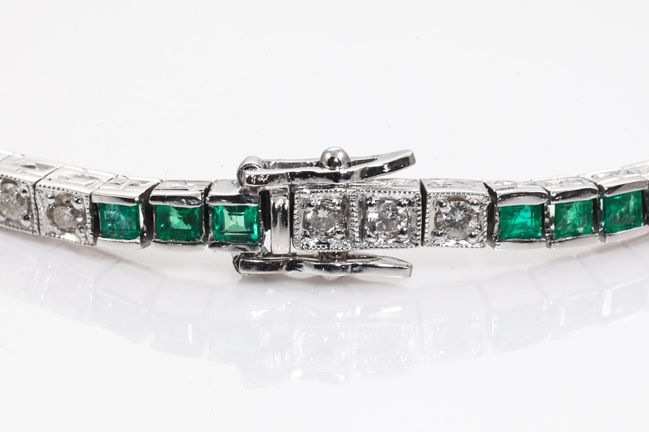 Emerald and Diamond bracelet with carre cut Emeralds totalling 1.60cts and round Diamonds totalling 1.00cts (Estimated grading: I-J SI-P1). 18ct white gold. Length: 16.5cm. Weight: 13.9g. (Pre-owned)
