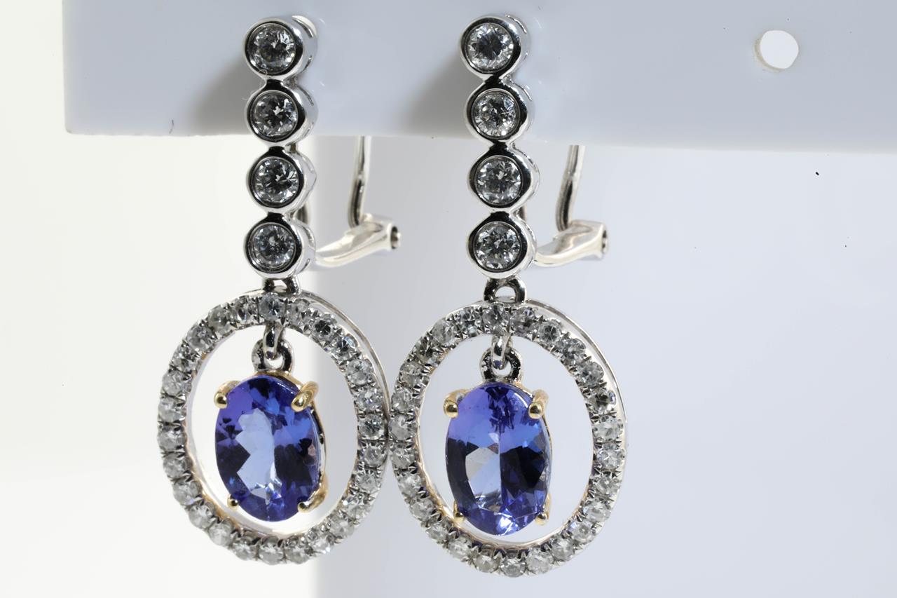Tanzanite and Diamond earrings with oval Tanzanites totalling 1.60cts and Diamonds totalling 0.67cts (Estimated grading: H P1-2). 14ct yellow & white gold. Weight: 4.5g. (As new)