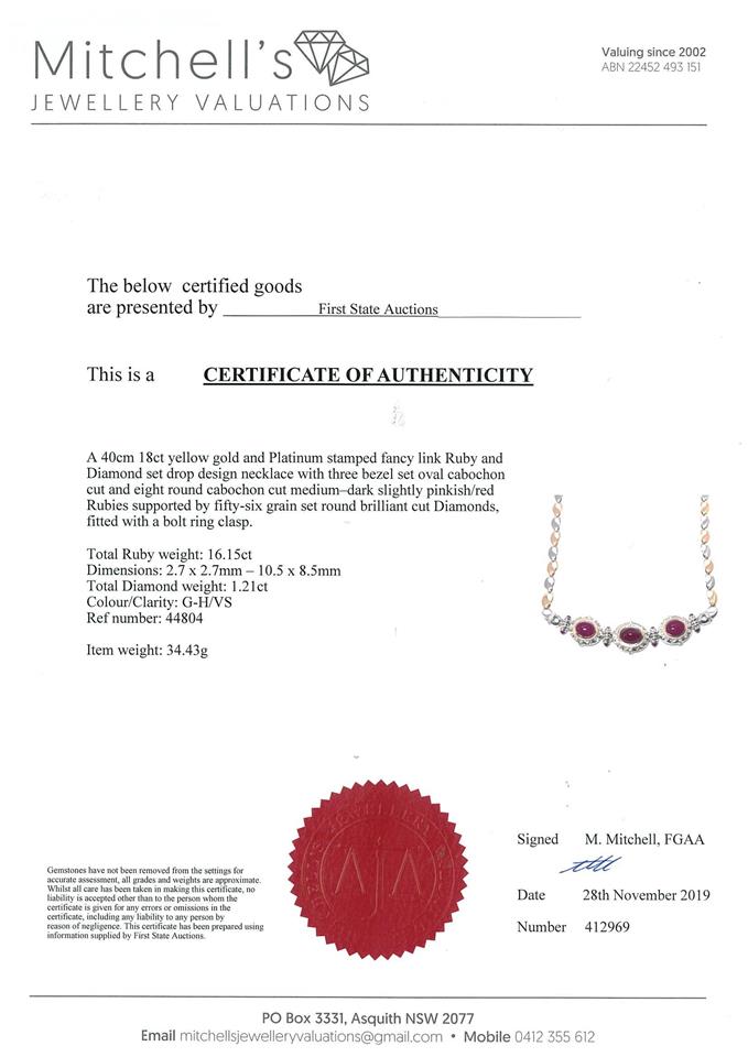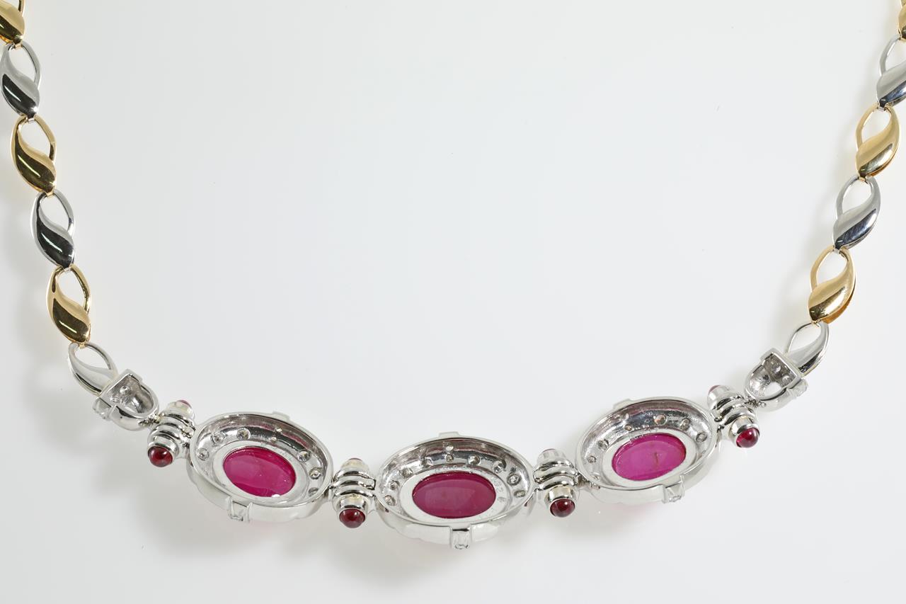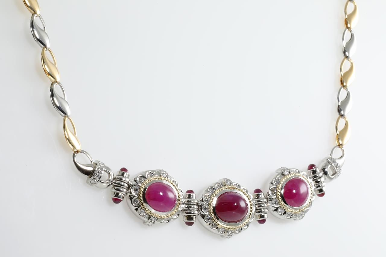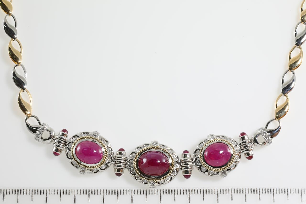 Cabochon Ruby and Diamond necklace with 3 oval cabochon cut Rubies of 6.08ct, 5.17ct, 4.90ct and Diamonds totalling 1.21cts (Estimated grading: G-H VS). 18ct yellow and platinum. Length 40cm. With Certificate #412969. Weight: 34.4g. (Pre-owned)