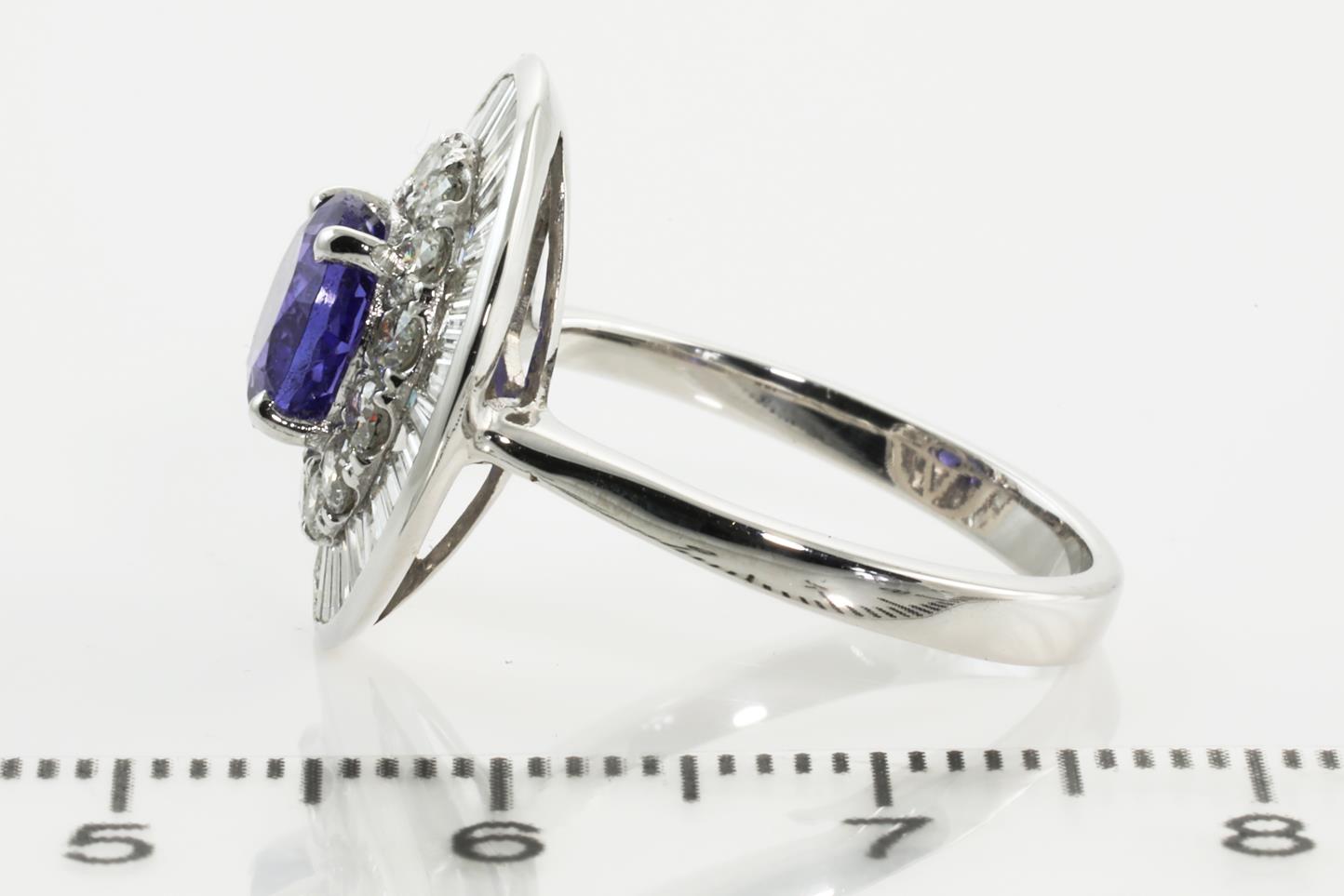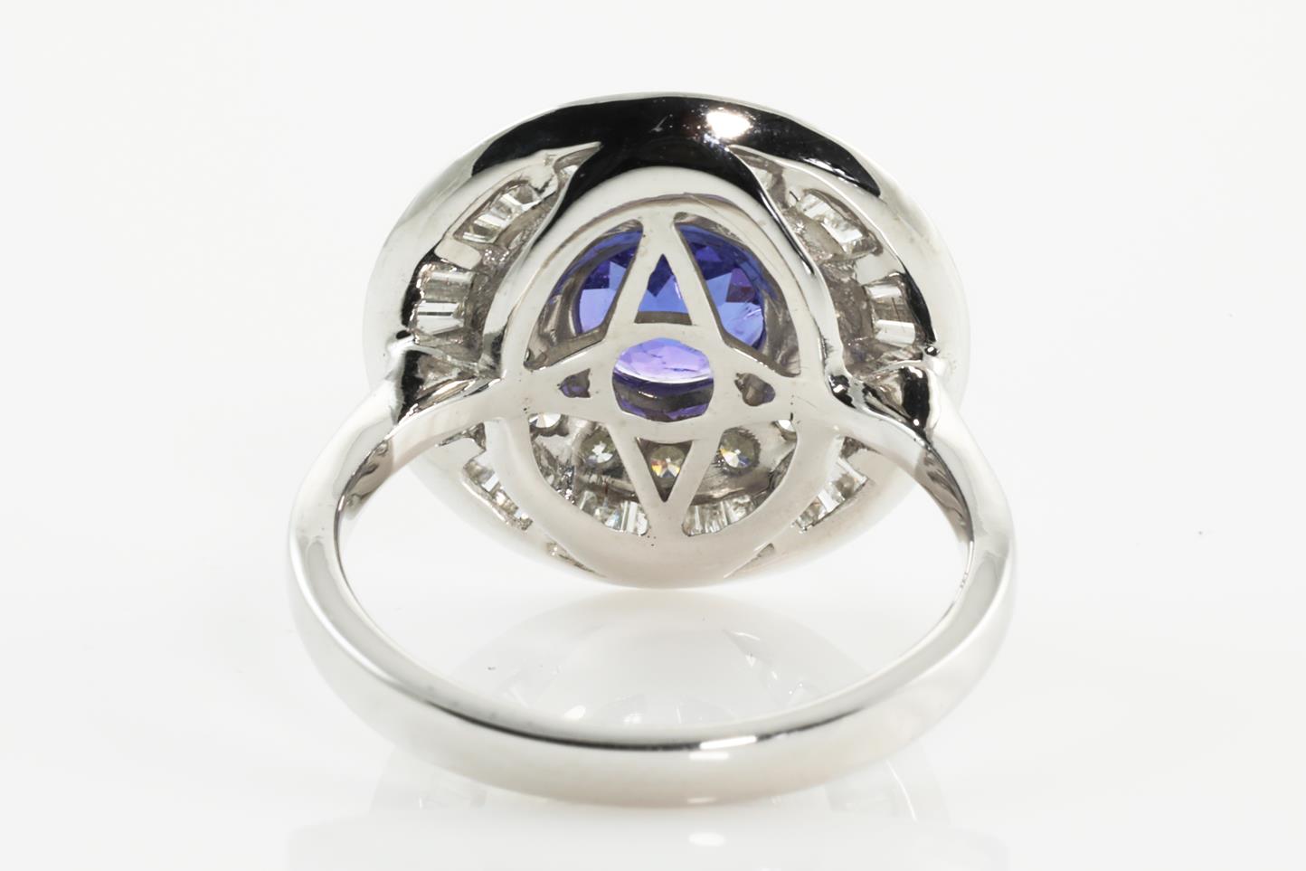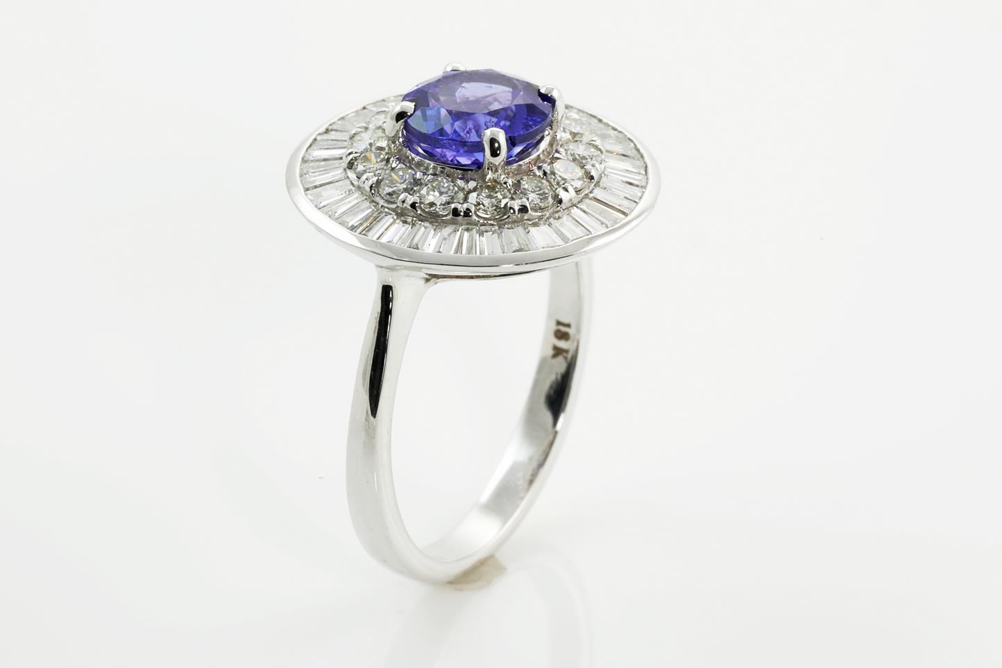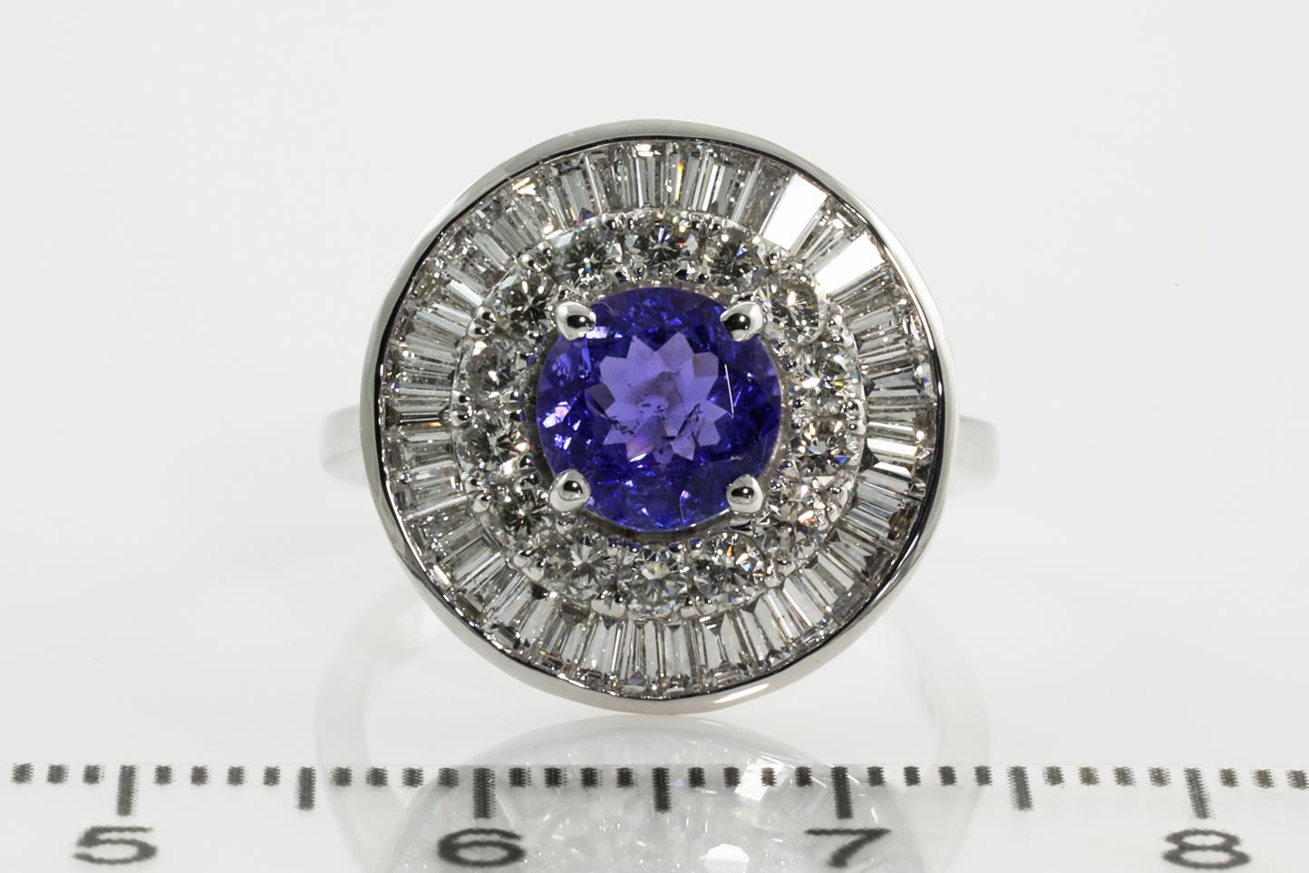 Tanzanite and Diamond ring with round Tanzanite of 1.61ct and round & baguette cut Diamonds totalling 1.41cts (Estimated grading: G-H SI). 18ct white gold. Ring size: N. Weight: 5.4g (As new)