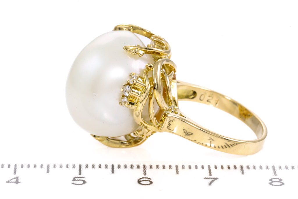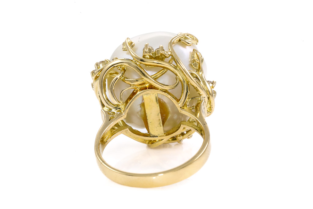 Pearl and Diamond ring with Baroque South Sea Pearl of 16.20mm and round Diamonds totalling 0.21cts. 18ct yellow gold. Ring size J. Weight: 11.5g. (Pre-owned)
