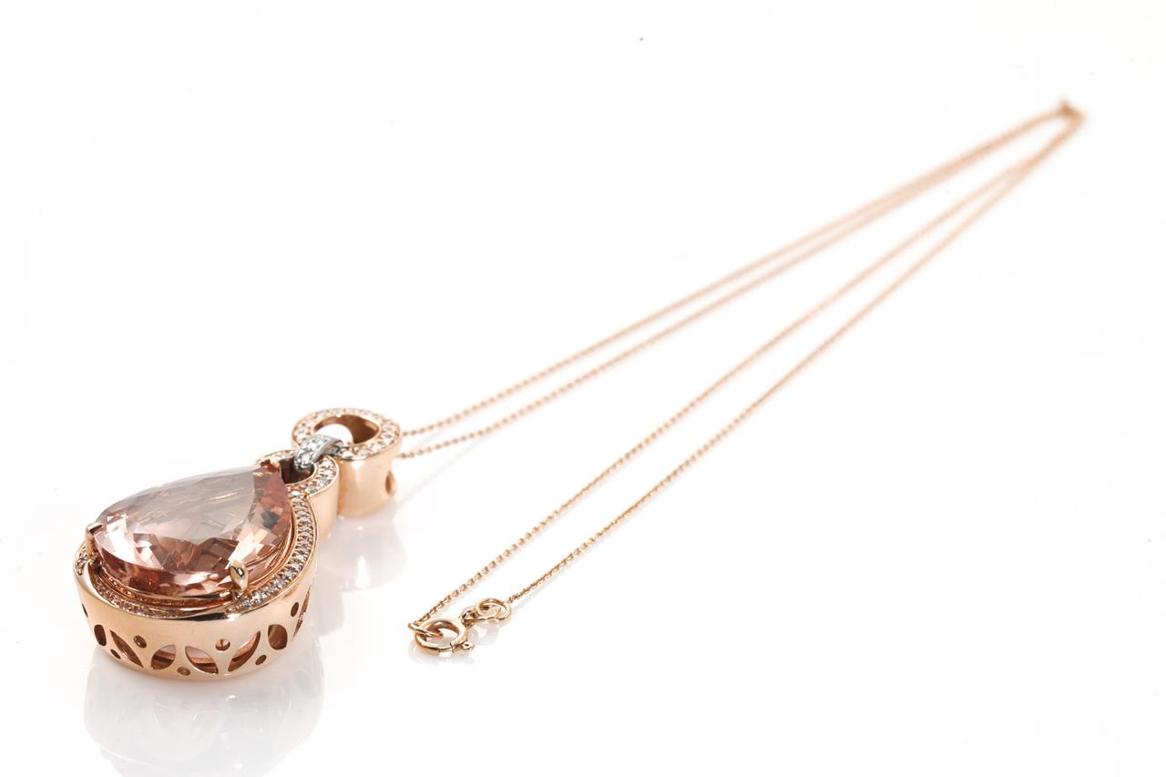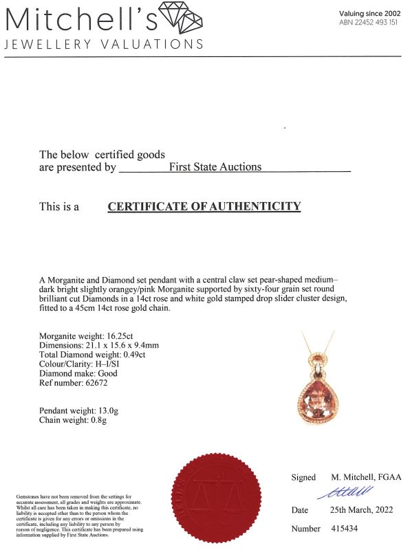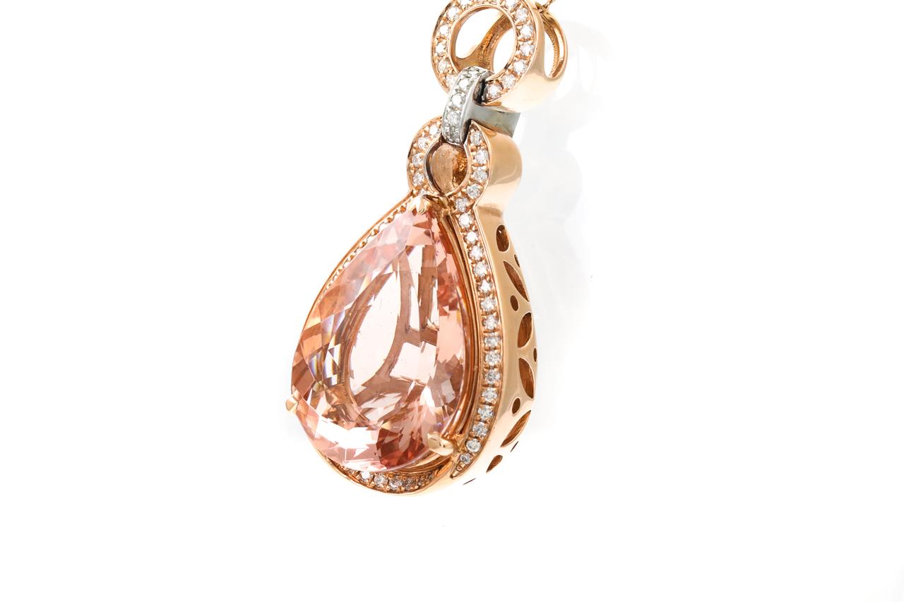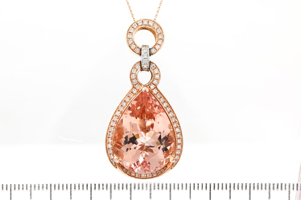 Morganite and Diamond Pendant with pear shape Morganite of 16.25ct and round Diamonds totalling 0.49cts (Estimated grading: H-I SI). 14ct rose and white gold with 45cm rose gold chain. Weight: 13.8g. With Certificate #415434. (As New)