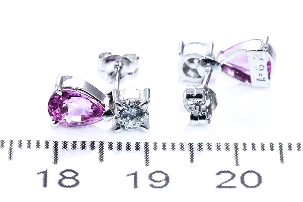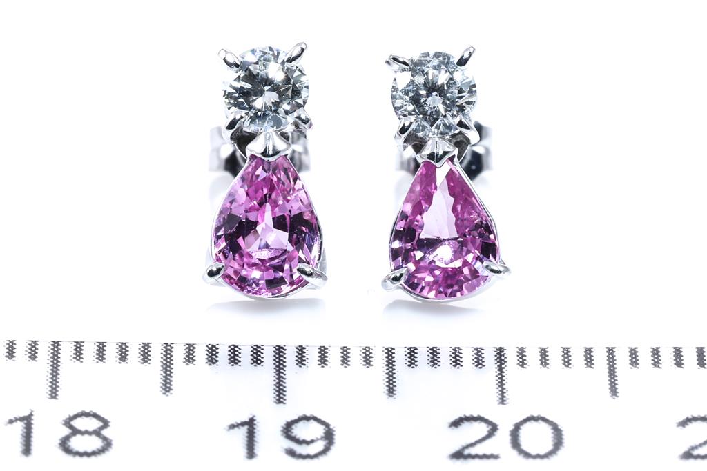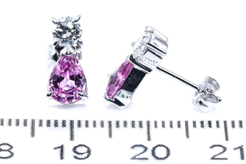 Sapphire and Diamond earrings with pear shape pink Sapphires totalling 1.62cts and round Diamonds totalling 0.43cts (Estimated grading: H-I SI). Platinum with platinum backs. Weight: 2.4g. (Pre-owned)