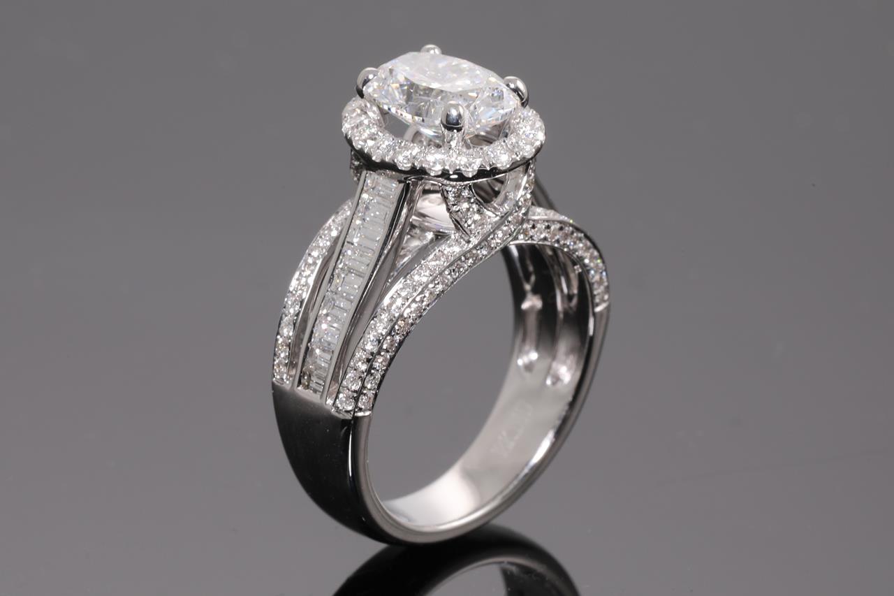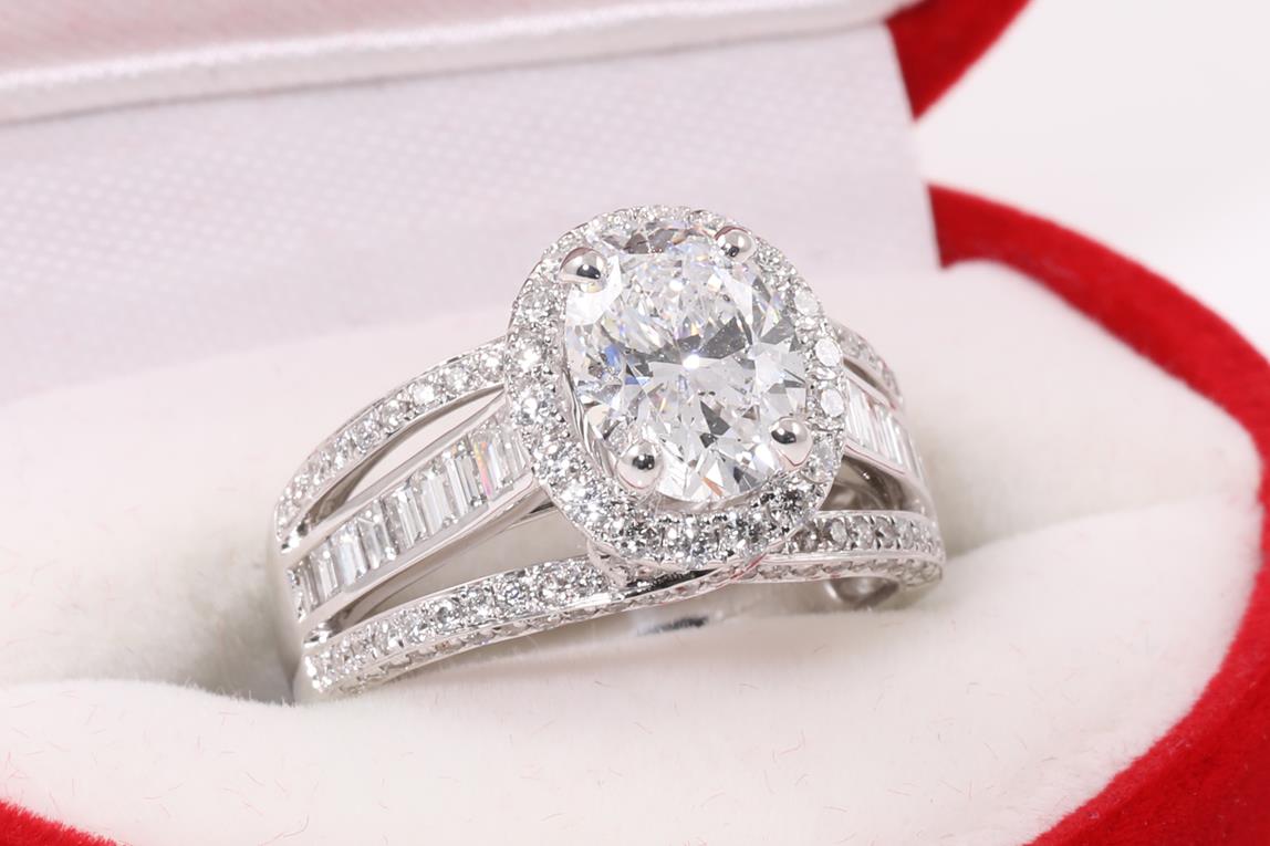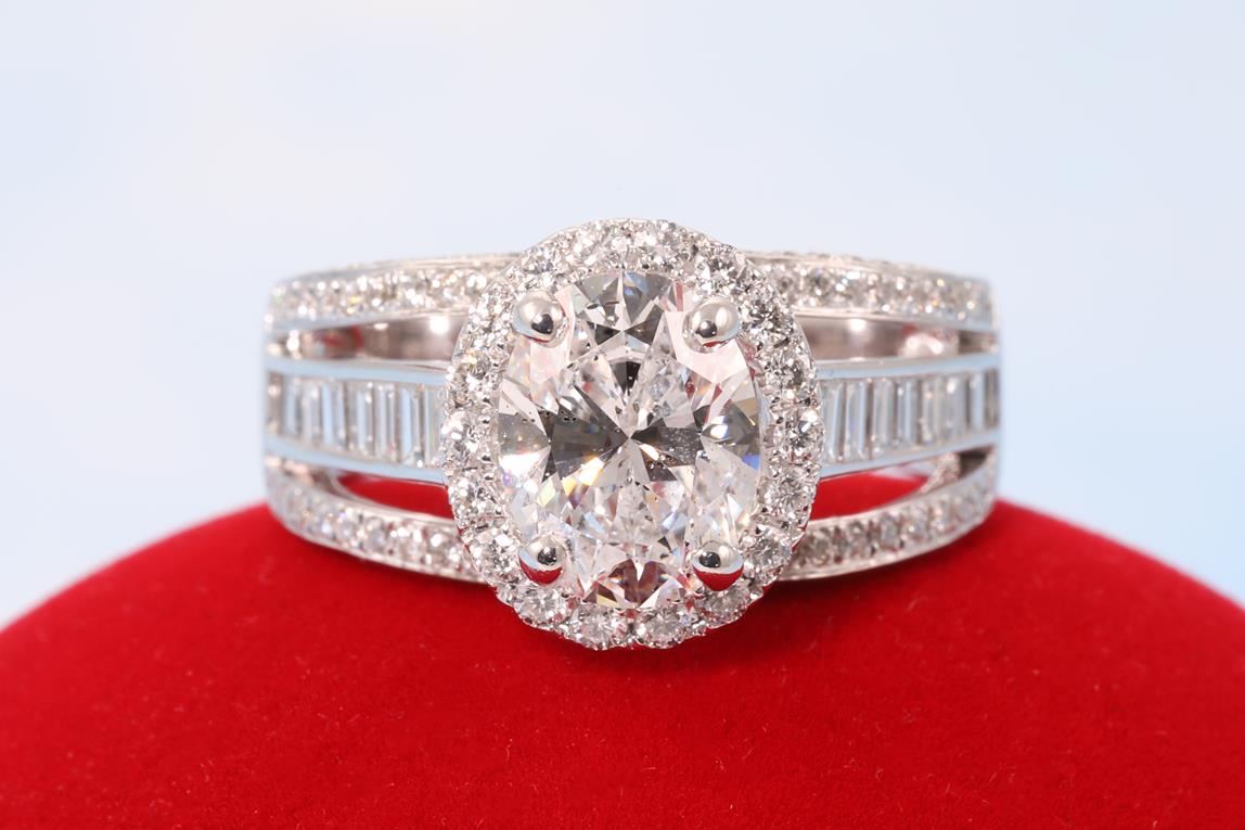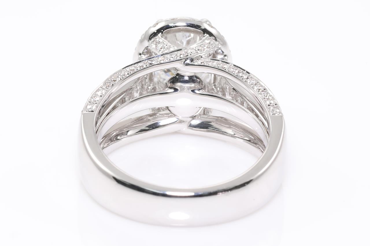 Diamond Halo Ring with a central oval cut Diamond of 1.63ct (with HRD certificate, graded as E SI2 #20044629708), surrounded by baguette cut and round cut Diamonds totalling 1.17cts (estimated grading; G VS-SI) in 18ct white gold. Ring size K. Weight 7.5g. (Pre-owned).