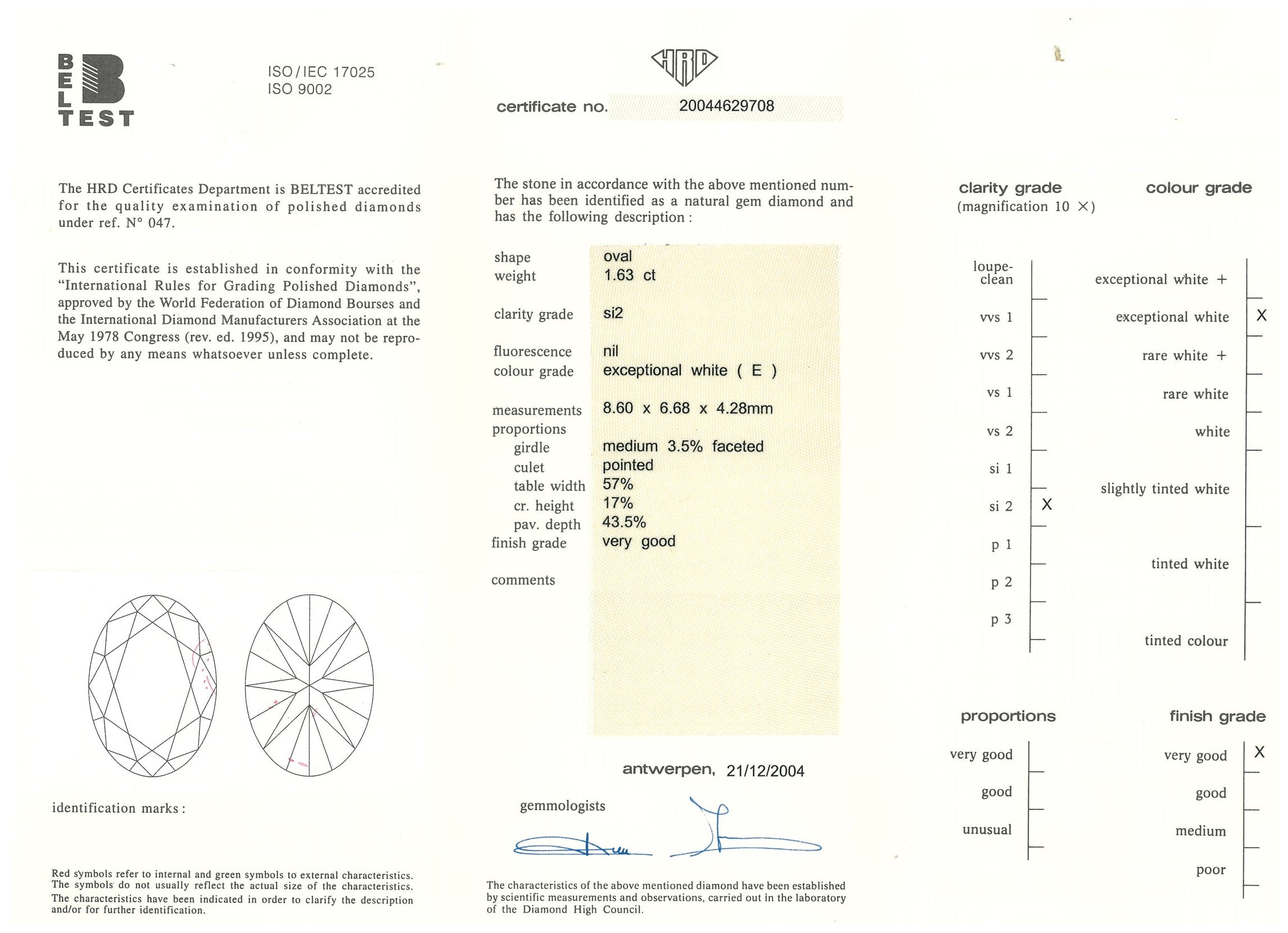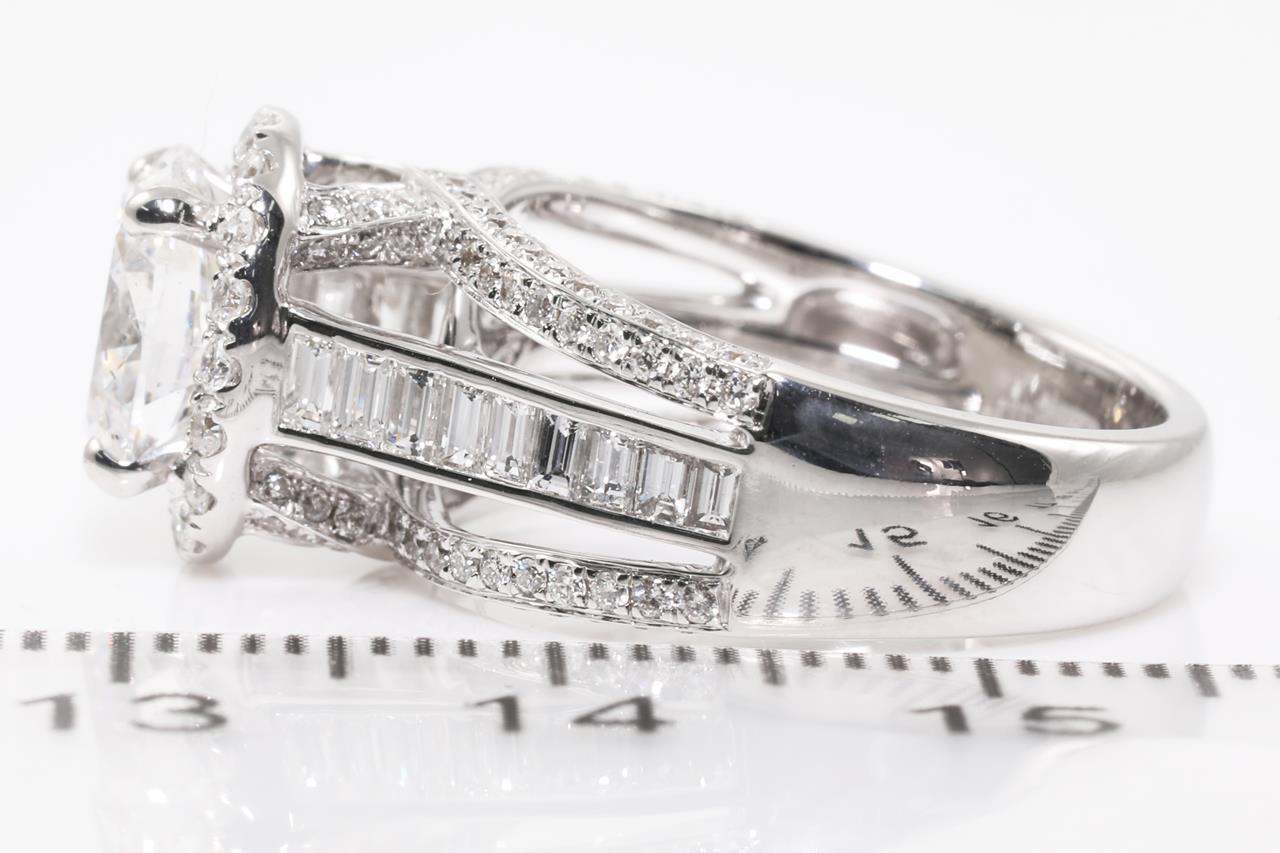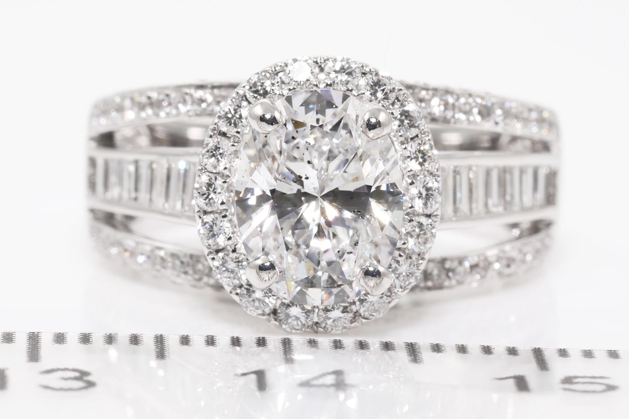 Diamond Halo Ring with a central oval cut Diamond of 1.63ct (with HRD certificate, graded as E SI2 #20044629708), surrounded by baguette cut and round cut Diamonds totalling 1.17cts (estimated grading; G VS-SI) in 18ct white gold. Ring size K. Weight 7.5g. (Pre-owned).