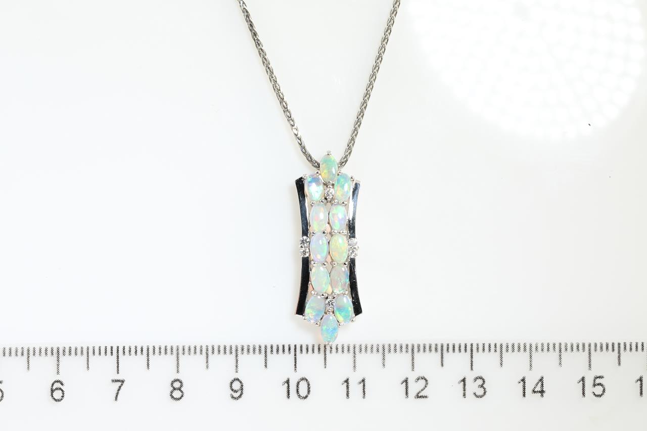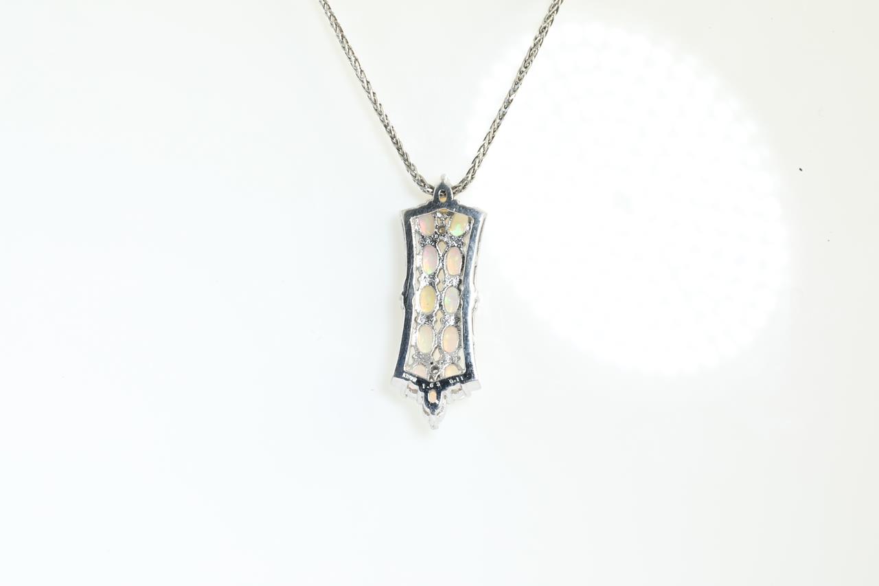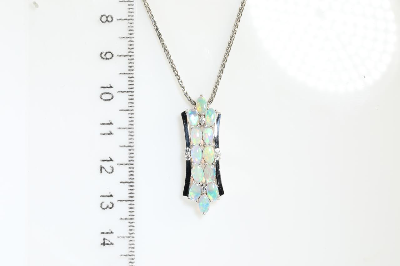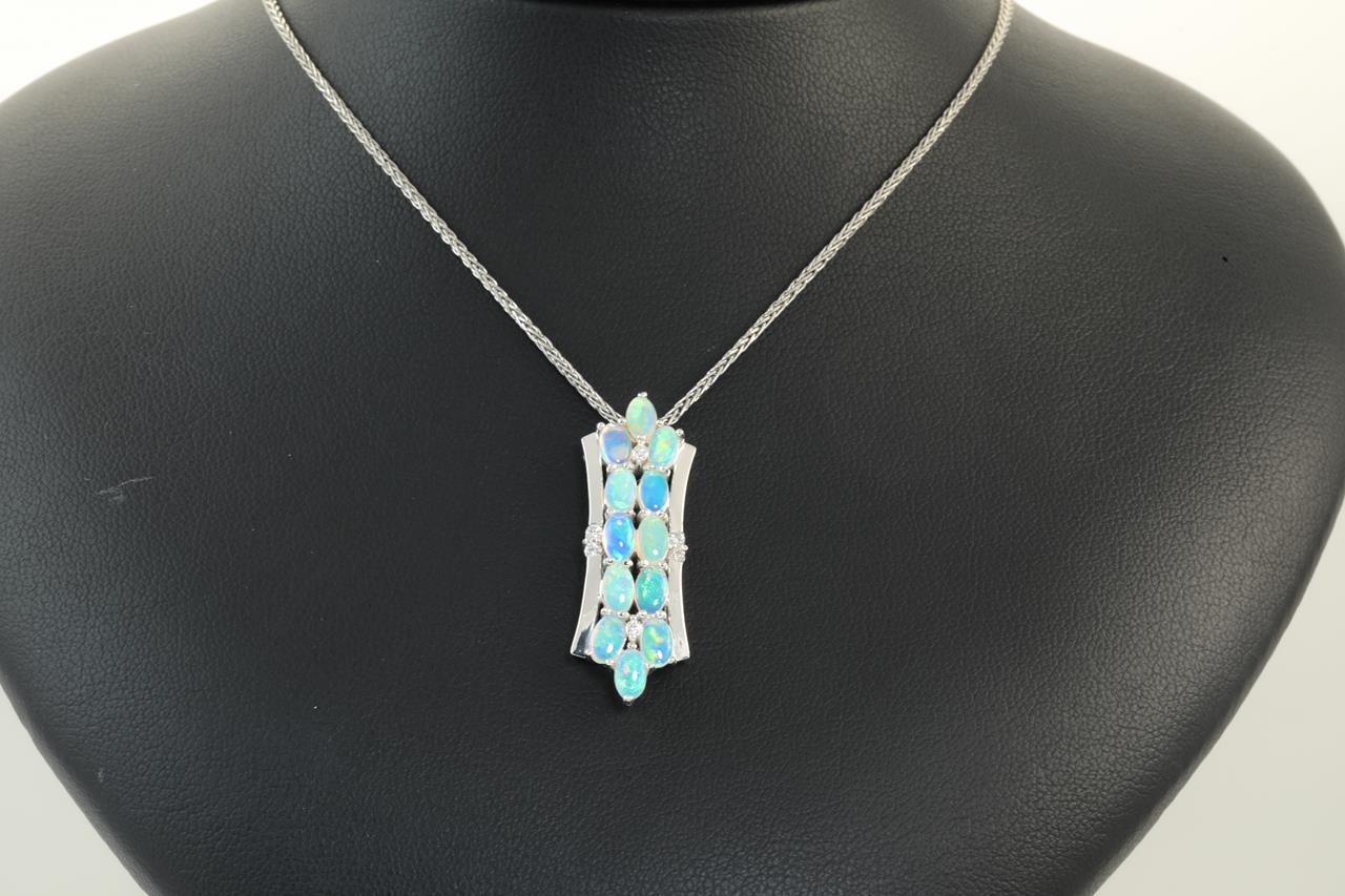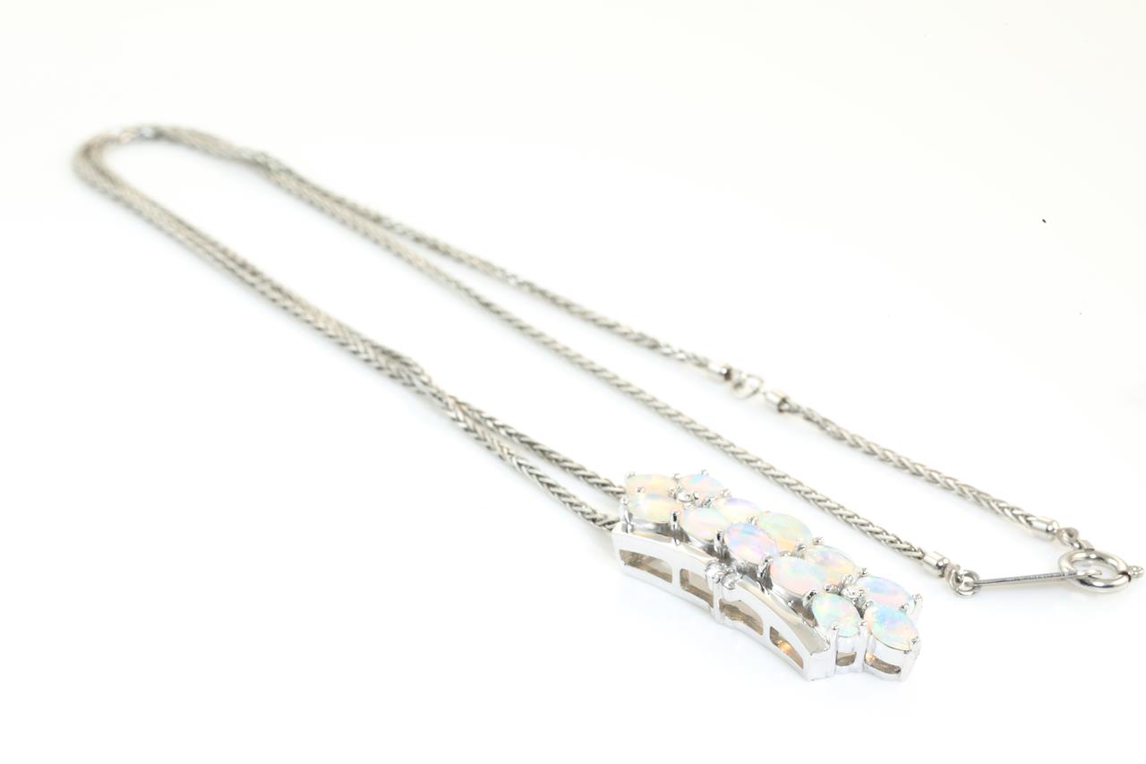 Opal and Diamond pendant with oval Opals totalling 1.63cts and Diamonds totalling 0.11cts (Estimated grading: G-H VS). 18ct white gold with platinum 42cm chain. Weight: 11.2g (Pre-owned).