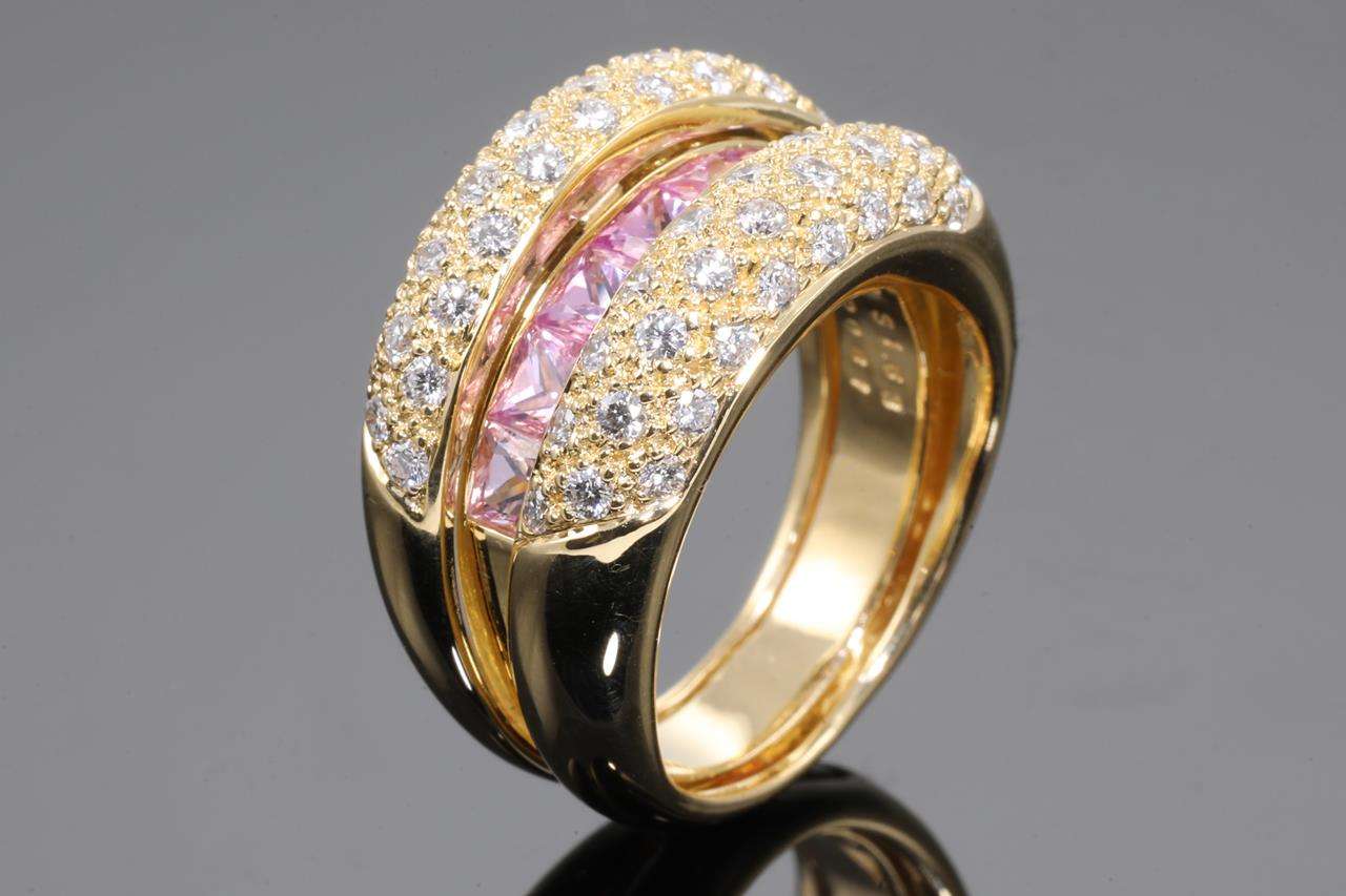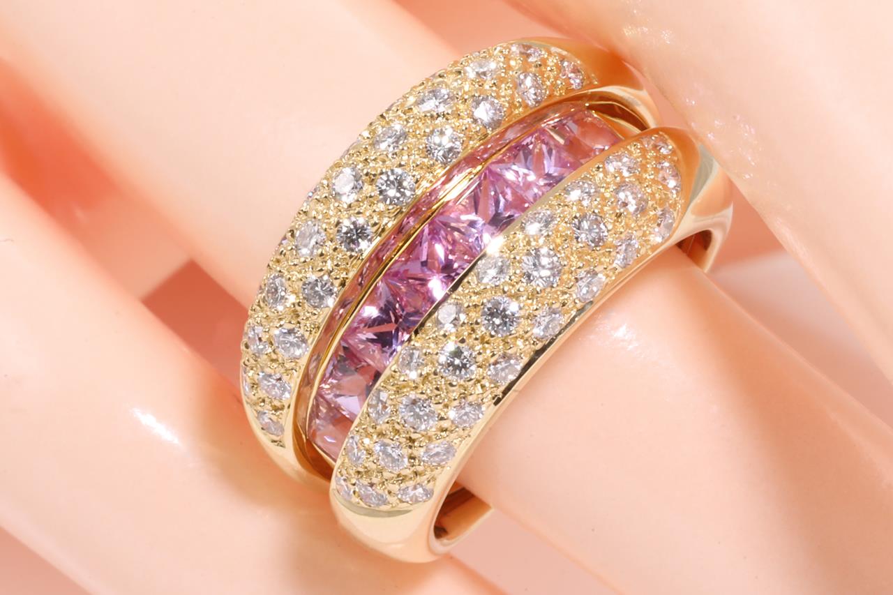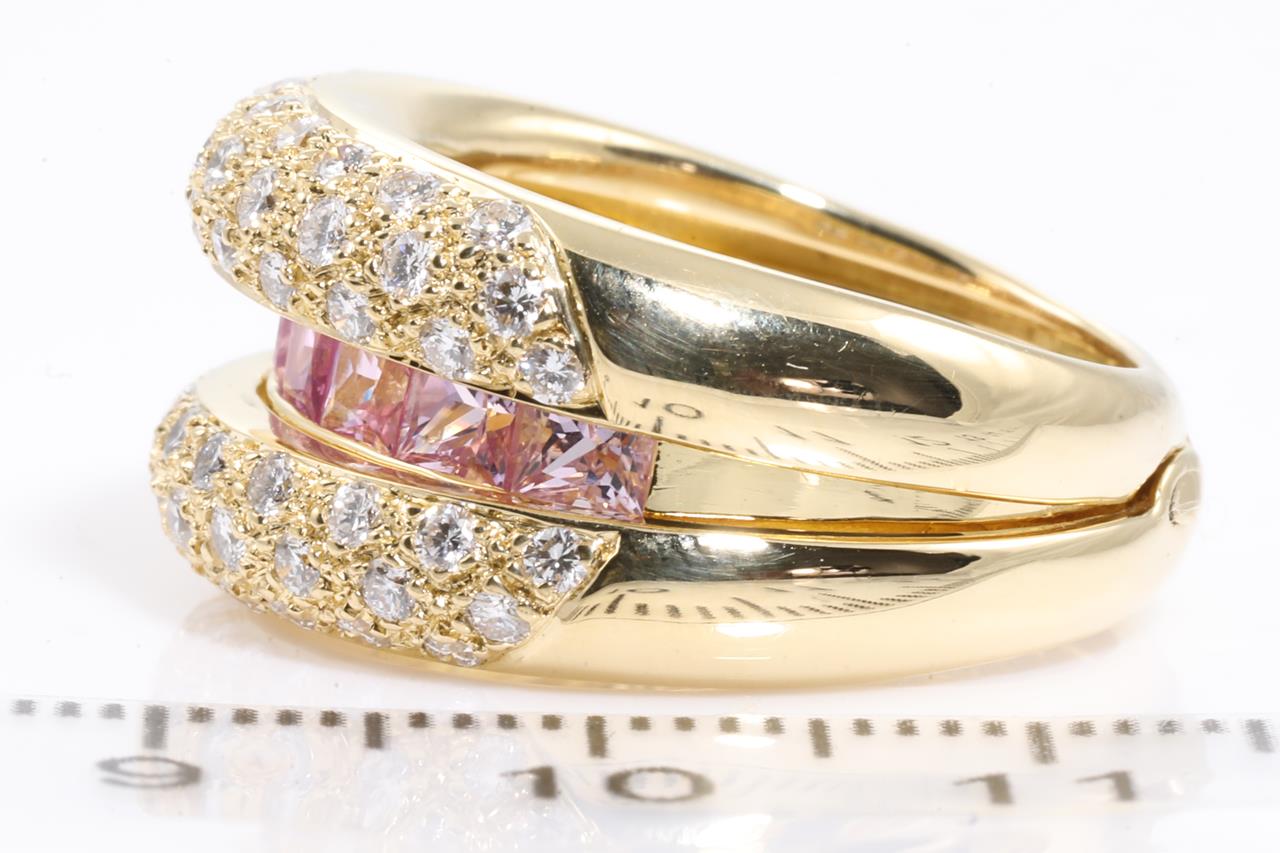 Sapphire and Diamond retractable ring with princess cut pink Sapphires totalling 1.63cts and Diamonds totalling 0.81cts (Estimated grading: G VS). 18ct white gold. Ring opens vertically to reveal Sapphires. Ring size L - ring resizing is not recommended. Weight: 13.5g. (Pre-owned)