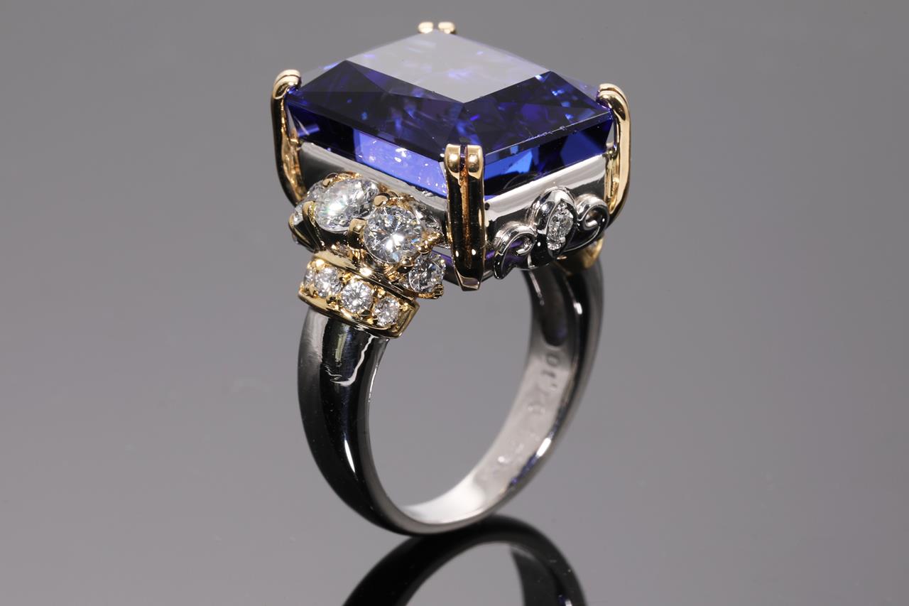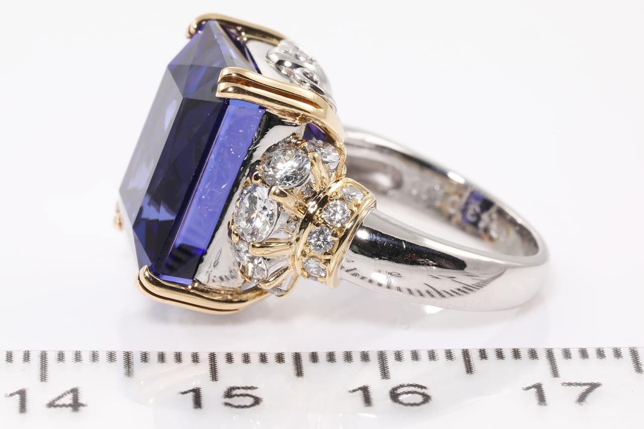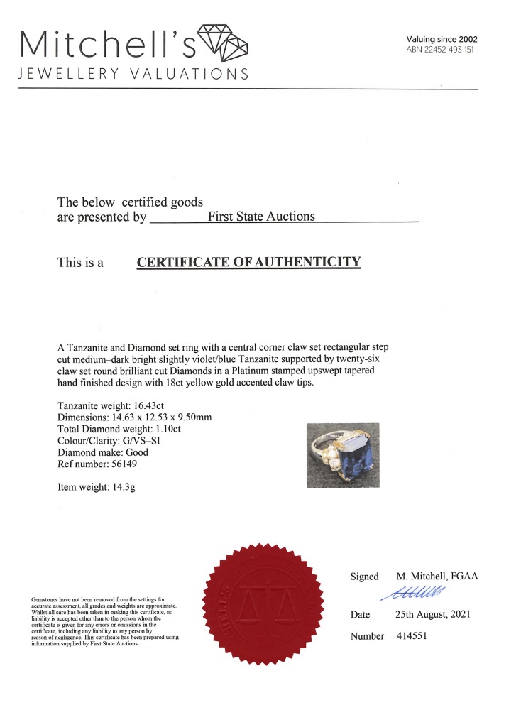 Tanzanite and Diamond ring with a rectangular step cut Tanzanite of 16.43ct and Diamonds totalling 1.10cts (Estimated grading: G VS-SI). 18ct yellow gold and platinum. Ring size H1/2. Weight: 14.3g. With certificate #414551. (Pre-owned)