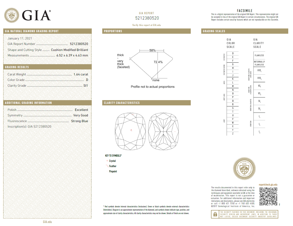 A Loose Cushion cut Diamond of 1.64ct (With GIA report graded as D SI1 #5212380520).(New)