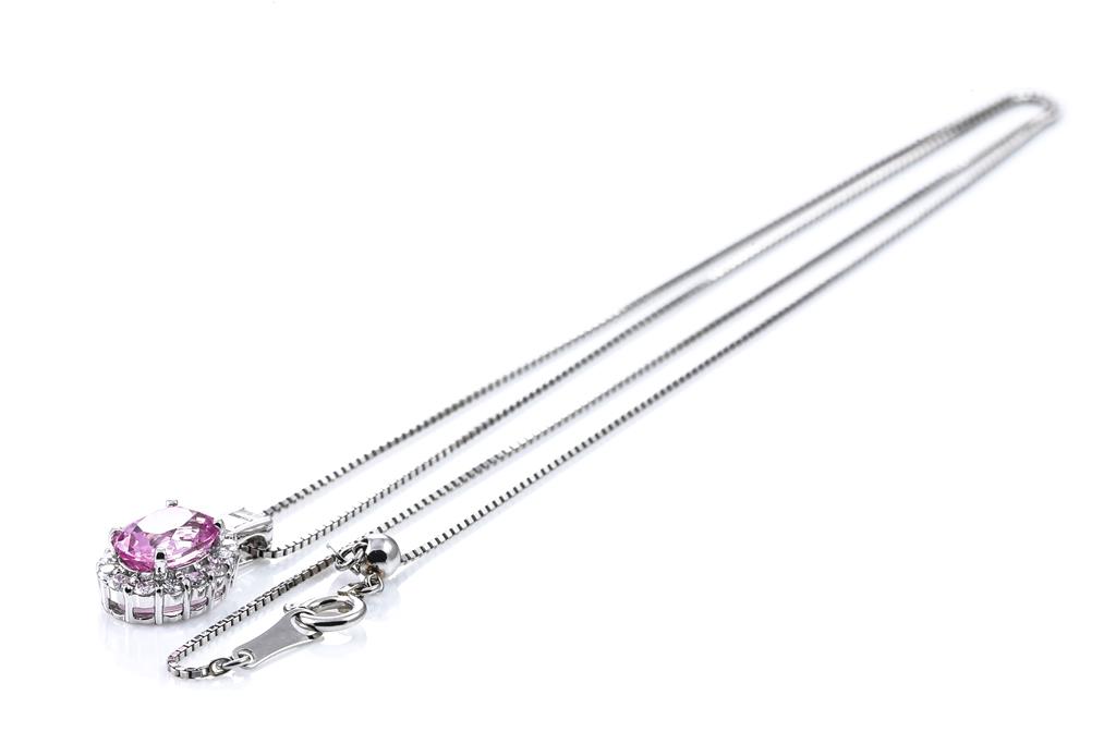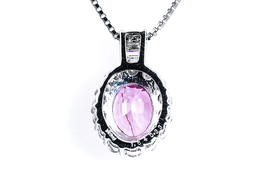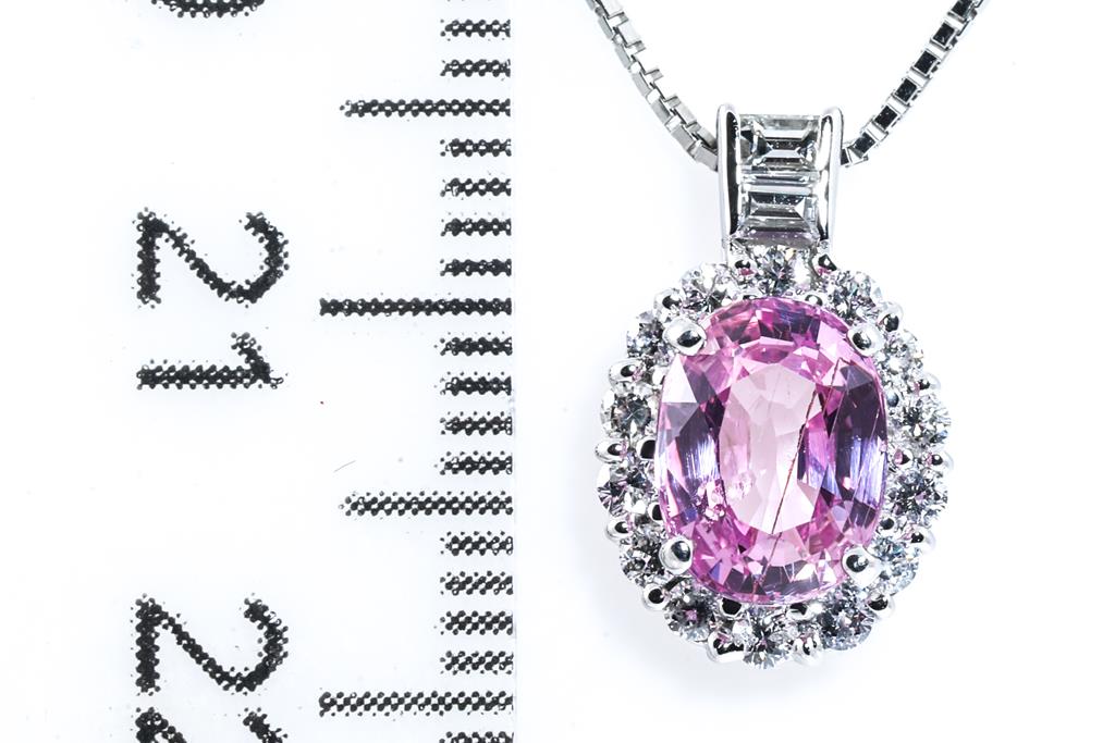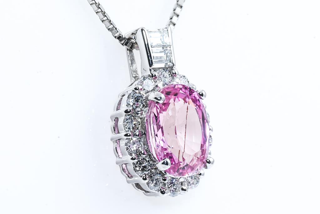 Sapphire and Diamond pendant with an oval shape Pink Sapphire of 1.64ct and round & baguette cut Diamonds totalling 0.33cts (Estimated grading: G-H P1). Platinum with adjustable 45cm platinum chain. Weight: 4g (Pre-owned)