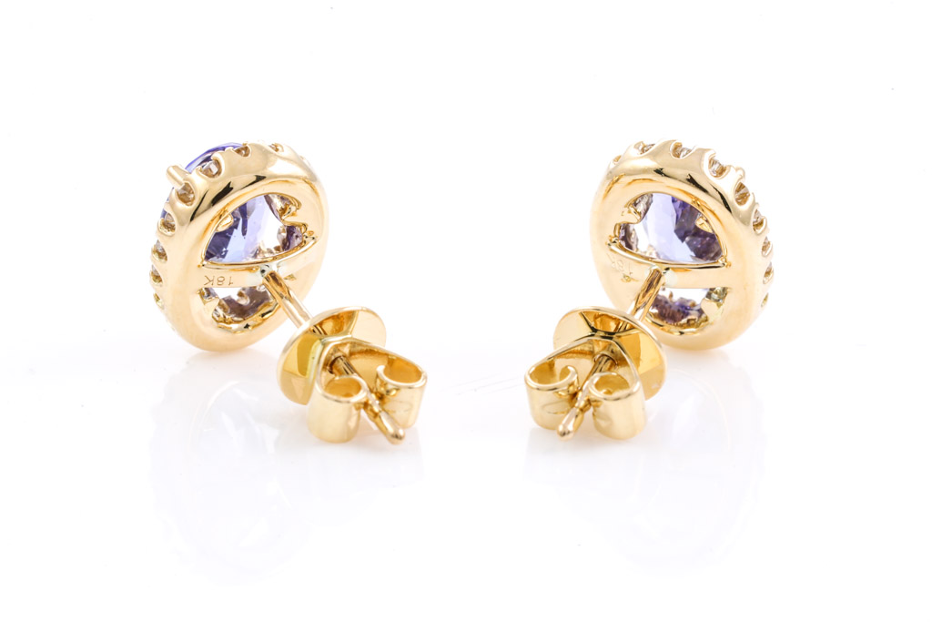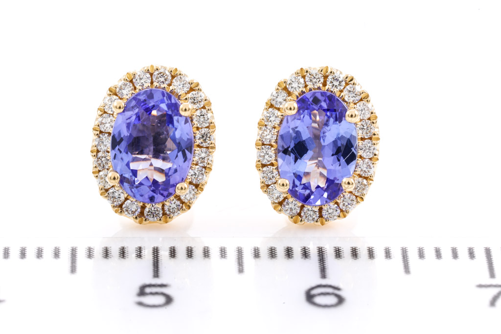 Tanzanite and Diamond earrings with oval Tanzanite shape totalling 1.64cts and round Diamonds totalling 0.24cts. 18ct yellow gold. Weight: 2.9g. (New)
