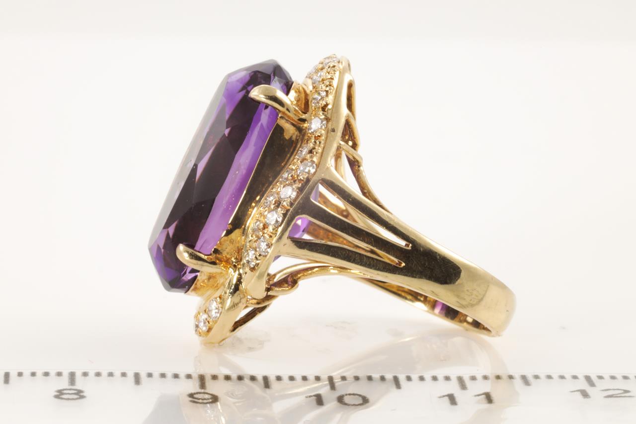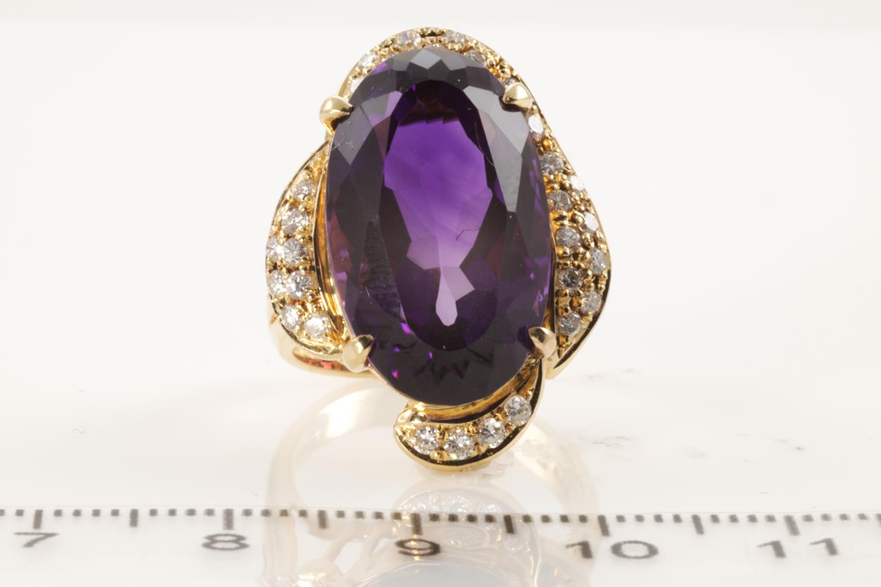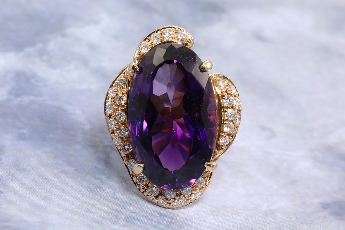 Amethyst and Diamond ring with an oval Amethyst of 16.50ct and Diamonds totalling approximately 0.60cts (Estimated grading: H SI). 14ct yellow gold. Ring size L1/2. Weight: 10.0g (Pre-owned)