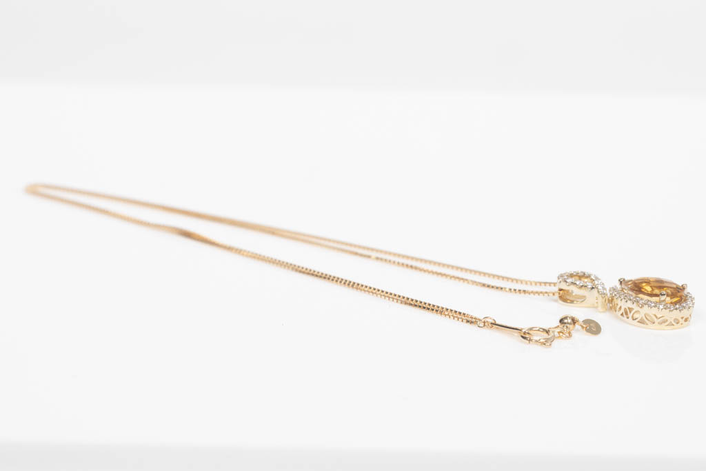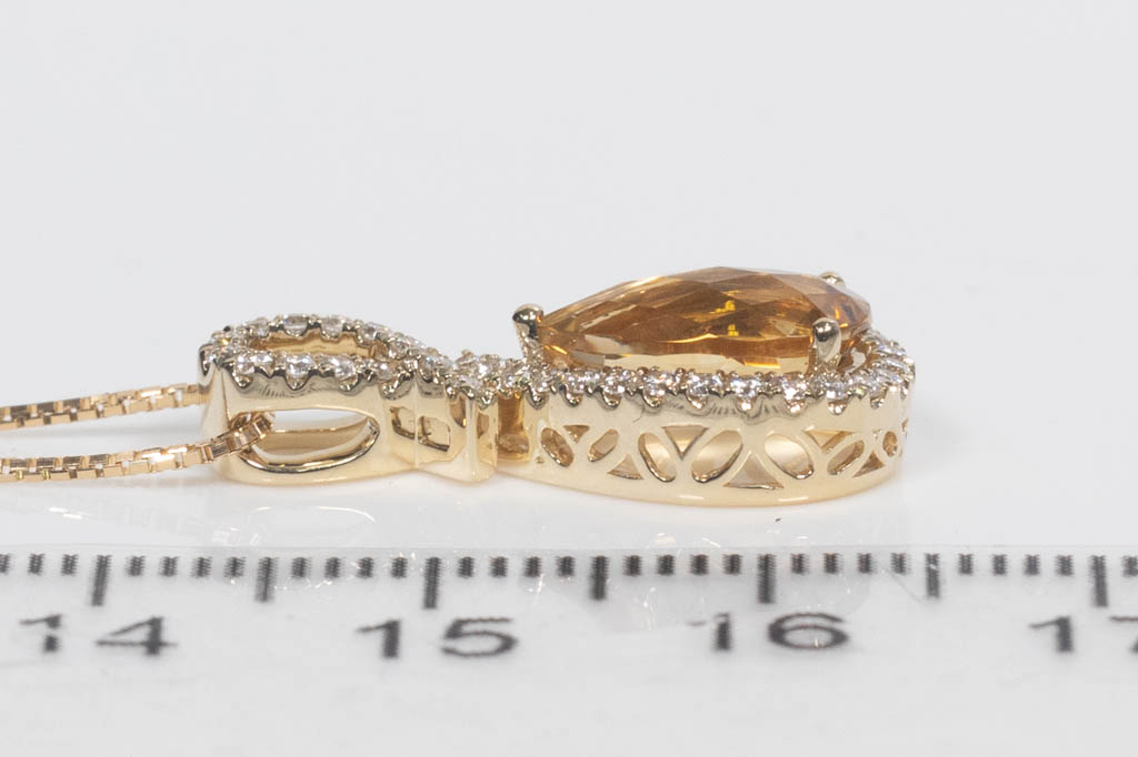 Citrine and Diamond pendant with pear shape Citrine of 1.65ct and round Diamonds totalling 0.29cts. 14ct yellow gold with 44cm 18ct yellow gold adjustable chain. Weight: 4.3g. (New)