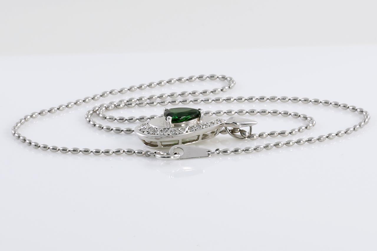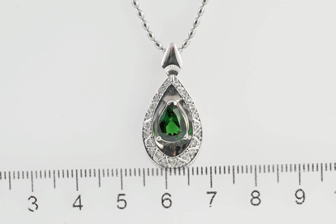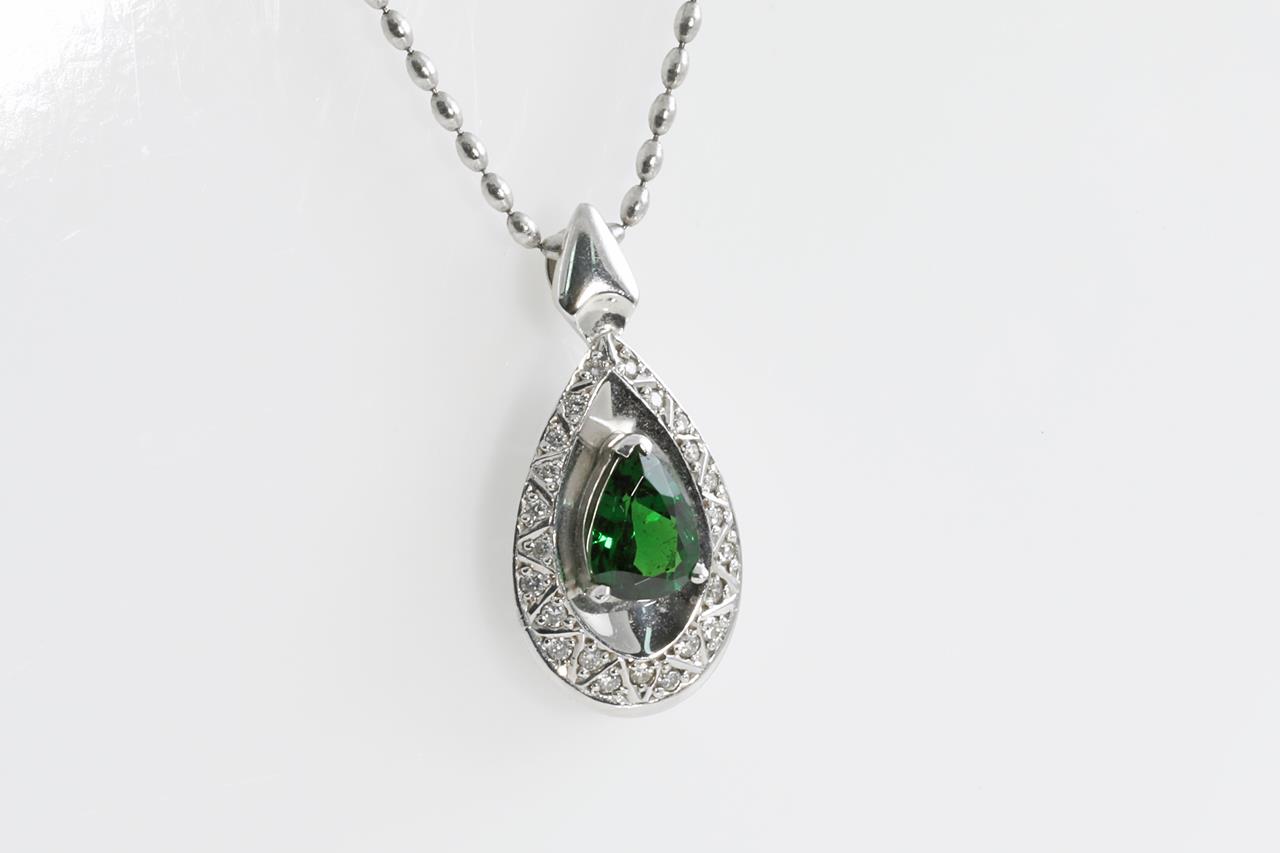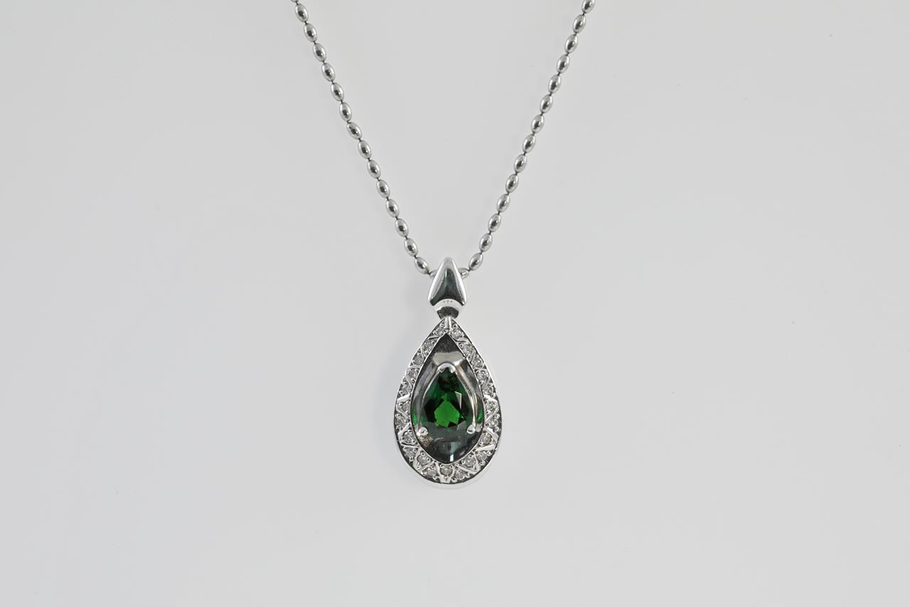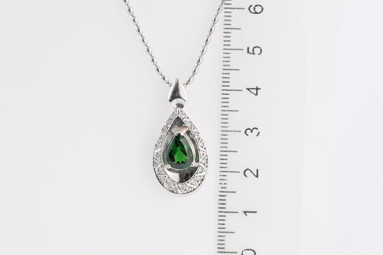 Garnet and Diamond Pendant with pear shape Garnet of 1.65ct and round Diamonds totalling 023cts. Platinum with platinum 42cm chain. Weight: 10.1g (Pre-owned)